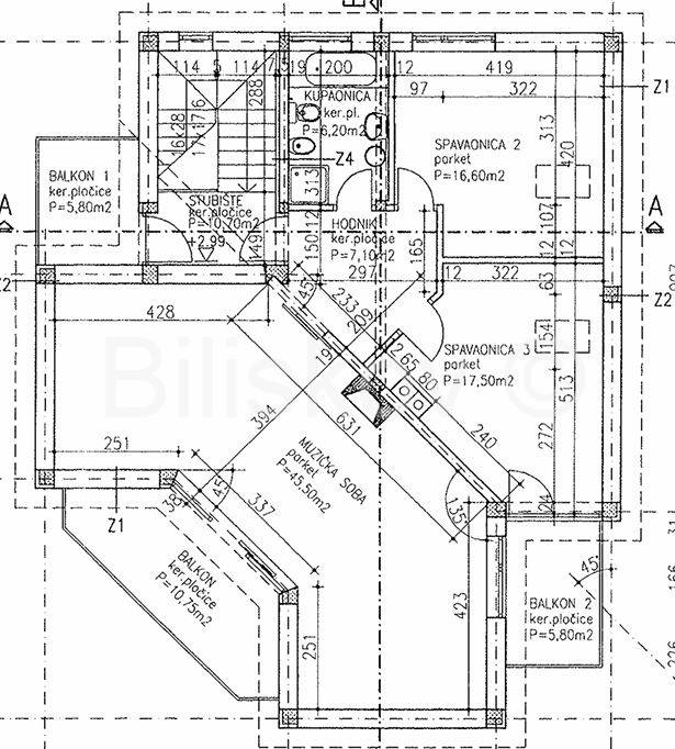 U potkrovlju se nalazi dnevna soba (45,50 m2), dvije spavaće sobe (16,60 i 17,50 m2), kupaonica (6,20 m2), hodnik (7,10 m2), stubišni prostor (10,70 m2), tri balkona (10,75 m2, 5,80 m2, 5,80 m2).