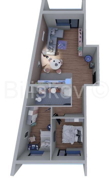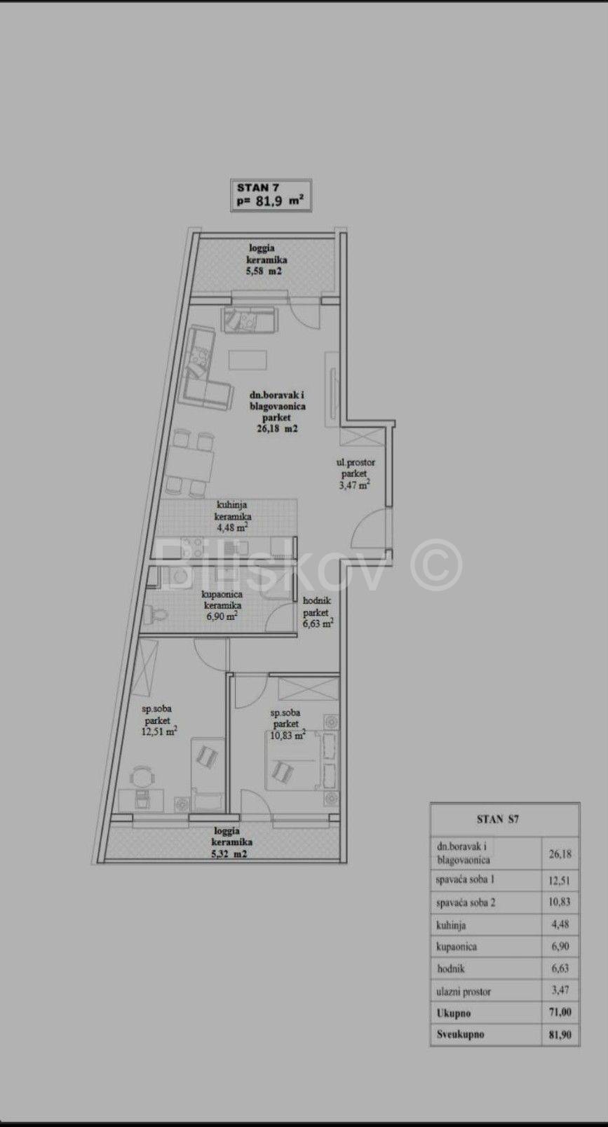 Stan, odličnog rasporeda, se sastoji od ulaznog hodnika, prostranog „open space” prostora koji objedinjuje kuhinju, blagovaonicu i dnevni boravak s izlazom na loggiu, moderne kupaonice te dvije udobne spavaće sobe, obje s izlazom na dodatnu loggiu.