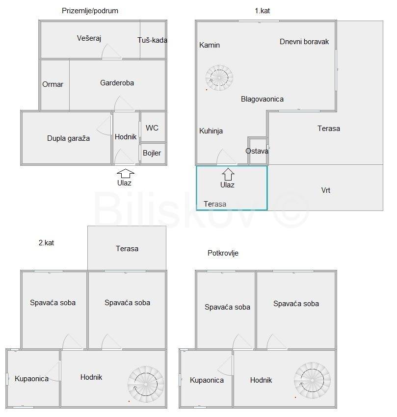 1. kat: mala kuhinja, blagovaonica veliki dnevni boravak sa kaminom. Ovaj kat je opasan popločanom terasom i ima vrt