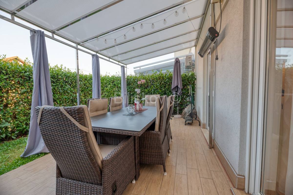 Peterosoban dvoetažni stan površine 106,00 m2 u prizemlju zgrade izgrađene 2010. godine sa vrtom i 2 parkirna mjesta u ograđenom dvorištu zgrade.