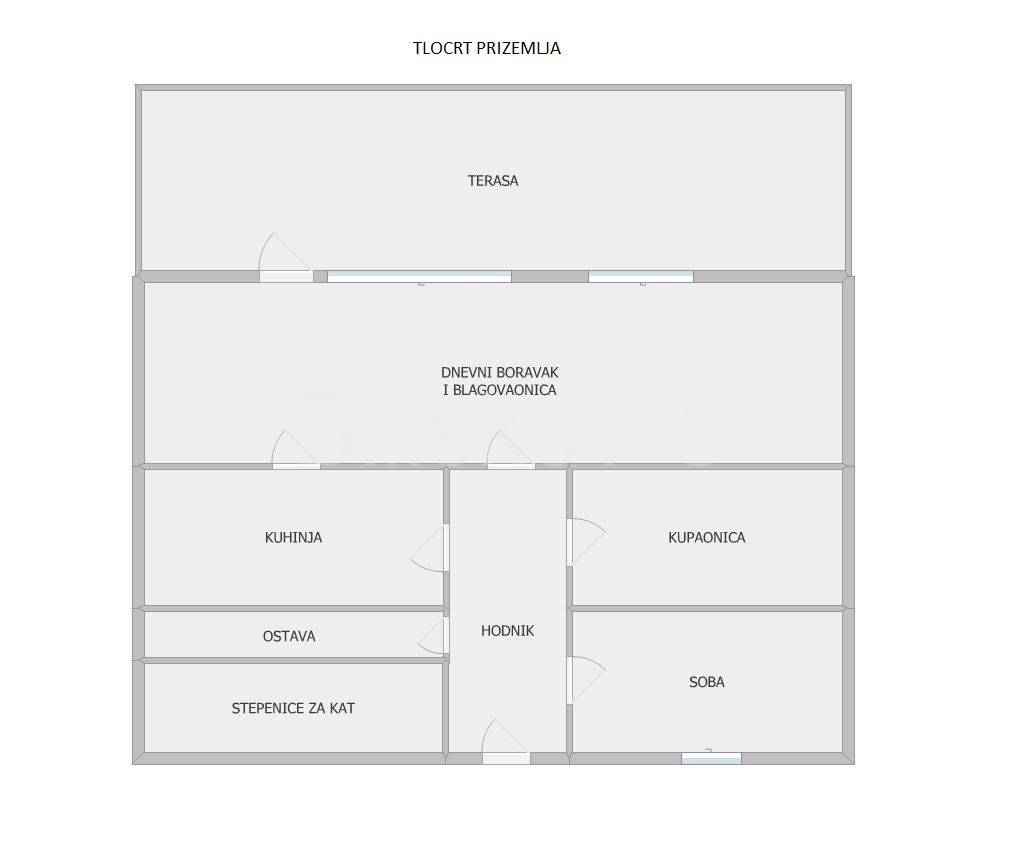 Prizemlje se satoji od ulaznog hodnika, sobe, ostave, kupaonice s WC-om, kuhinje, dnevnog boravka s blagovaonicom i vrta.