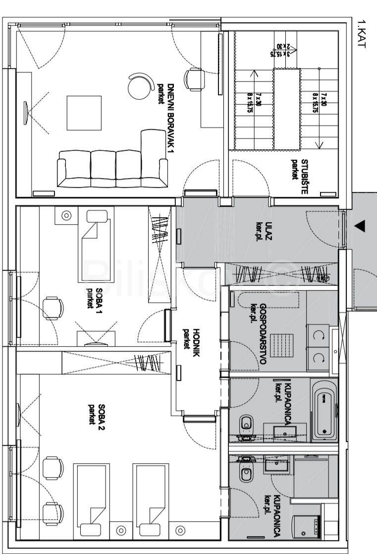 Gornja etaža: ulaz (8,70 m2, stubište (10,68 m2), dnevni boravak (24,33 m2), hodnik (4,36 m2), gospodarstvo (5,84 m2 ), kupaonica (4,68 m2 ), soba 1 (14,98 m2), soba 2 (24,35 m2), kupaonica (5,27 m2), ostava (5,25 m2).