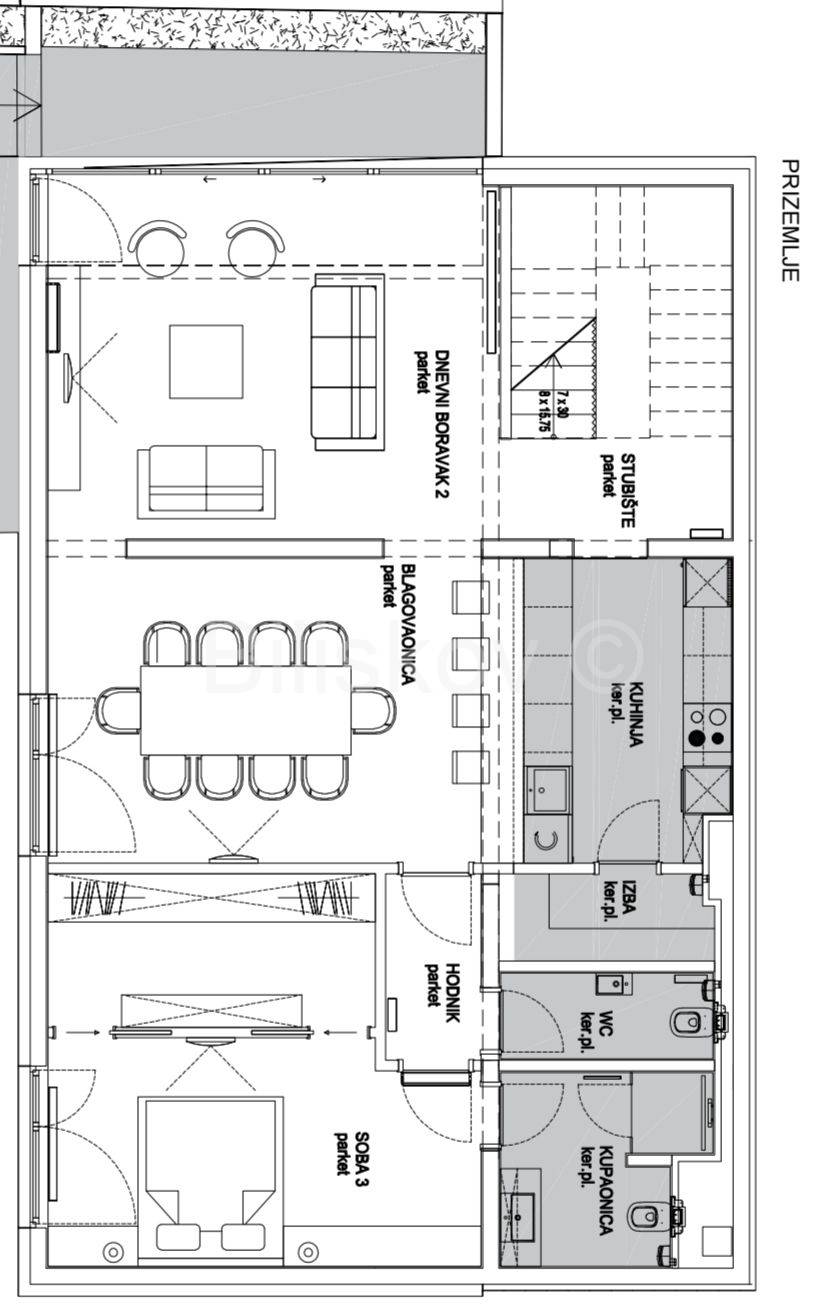 Donja etaža: stubište, hodnik (2,73 m2), dnevni boravak (24,98 m2), blagovaonica (21,72), kuhinja (9,47 m2), ostava (2,62 m2), soba/garderoba (22,51 m2 ), kupaonica (5,48 m2), wc (2,79 m2) i terasa (32,57 m2).
