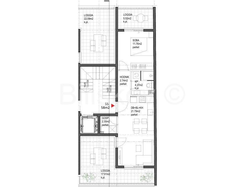Dvosoban stan površine 58 m2 na 2. katu moderne novogradnje s liftom čiji je završetak planiran u kolovozu 2026. godine.