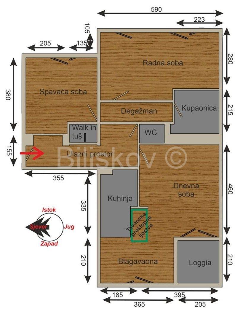 Stan se sastoji od velikog dnevnog boravka u sklopu kuhinje i blagovaone (otvoreni koncept), velike spavaće sobe s kupaonom, velike radne sobe s ugradbenim ormarima (prvobitno u tlocrtu dvije spavaće sobe), kupaone, gostinjskog wc-a i loggie (5m2).