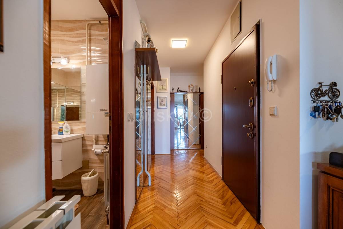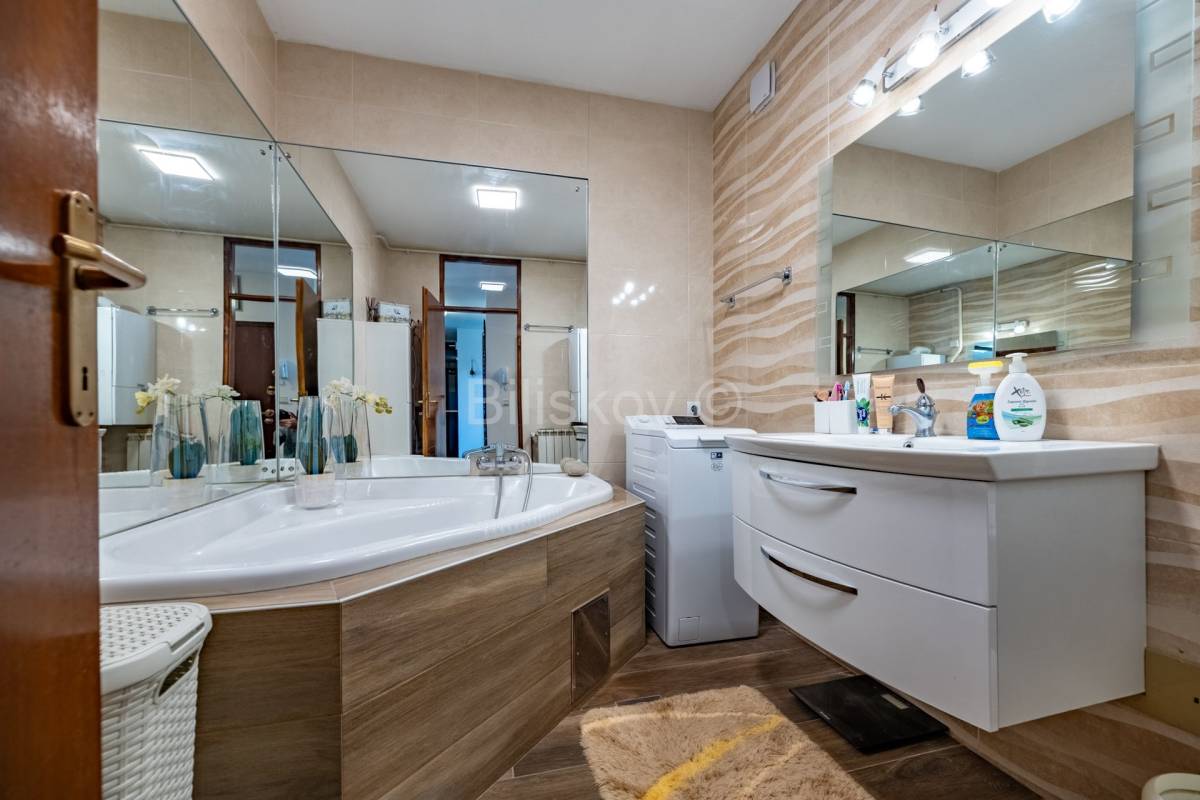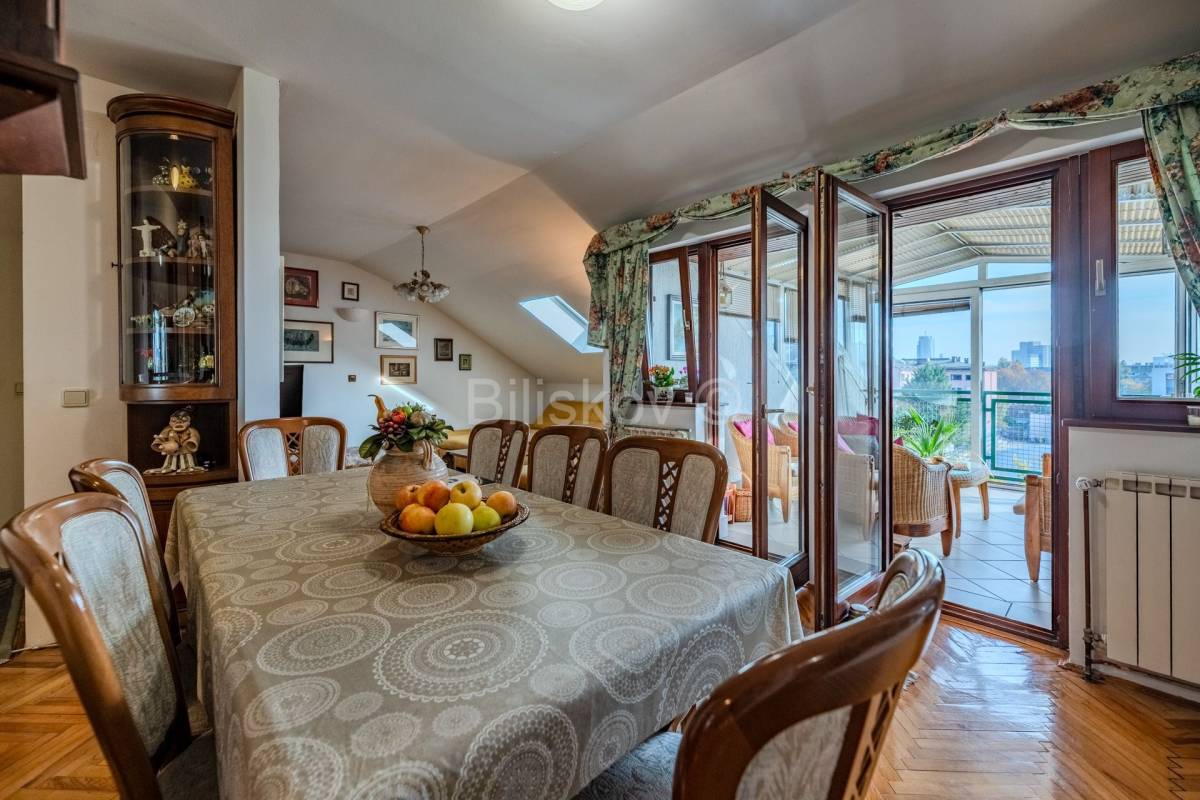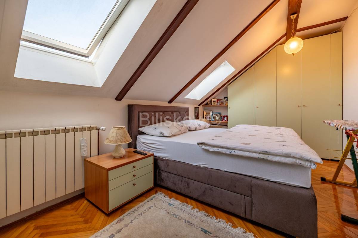 Lijep četverosoban komforan stan površine 103, 24 m2, na zadnjem katu zgrade koja je građena 1996. godine. Zgrada nema dizalo. Stan se sastoji od hodnika, dnevnog boravka koji je integriran sa kuhinjom , blagovaonicom, ostakljene i natkrivene terase, tri spavaće sobe, dvije kupaonice. Uz stan se prodaje i spremište od 4 m2 koje ima svoj vlasnički list. Terasa se nastavlja na blagovaonicu, kvadratnog je oblika i ima otvoren, prekrasan pogled na istočni dio Grada. U budućnosti , nema šanse da bi se izgradila neka građevina koja bi zaklonila ovako lijep pogled. Jedna kupaonica ima WC i tuš kabinu, a druga ima veliku kadu . Tu je i perilica i sušilica rublja. Obje kupaonice su renovirane 2023 godine. Stan se prodaje u viđenom stanju, dakle sa namjestajem i uređajima. Svi uređaji i namještaj su visoke kvalitete. Stan je okupan u svijetlu. Zgrada je građena armirano betonskim okvirom sa zidanim ispunom. Krovište je betonsko na kojem je šindra, a prije 7 godina je podaskano i stavljen je lim.