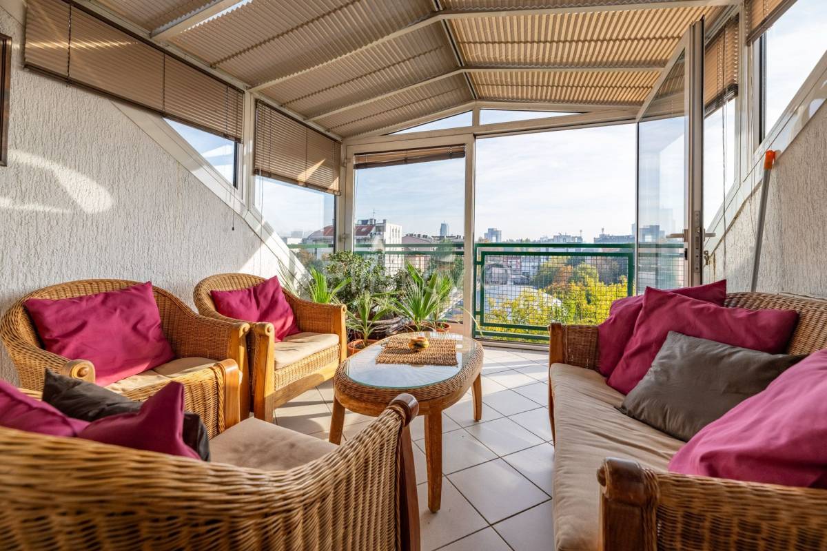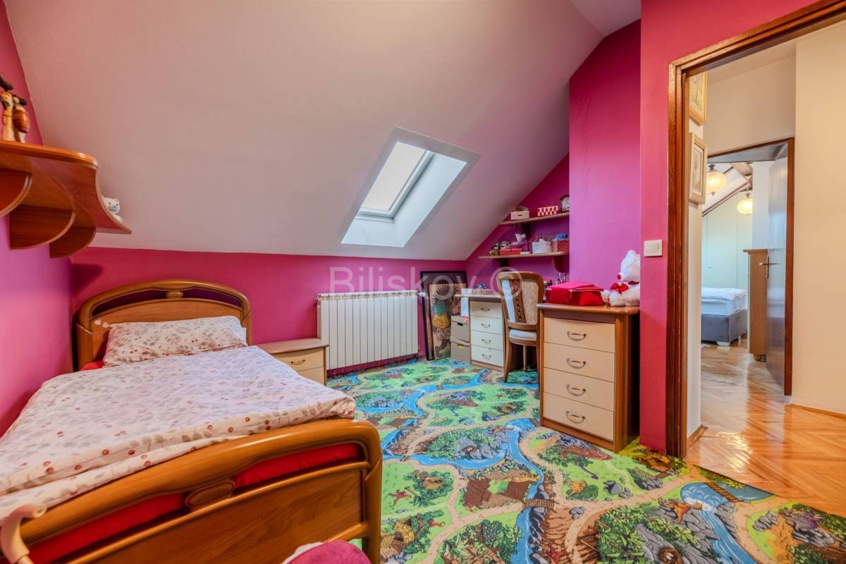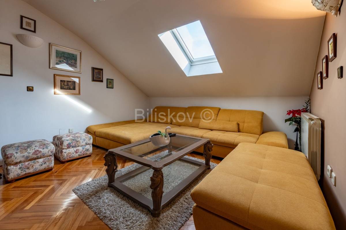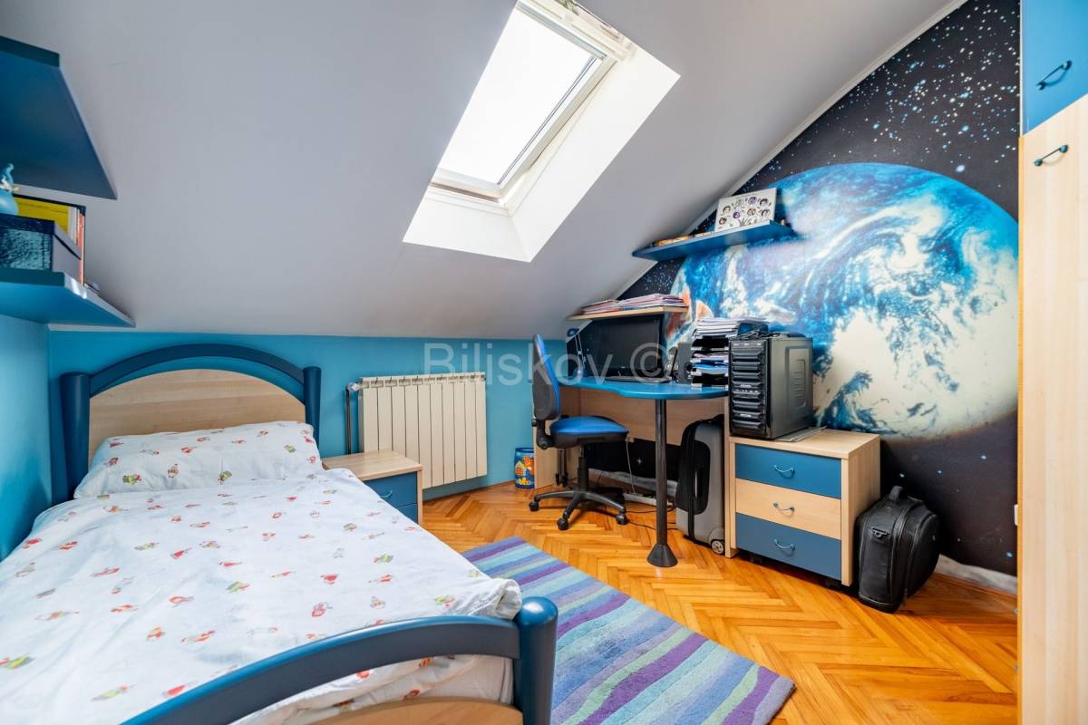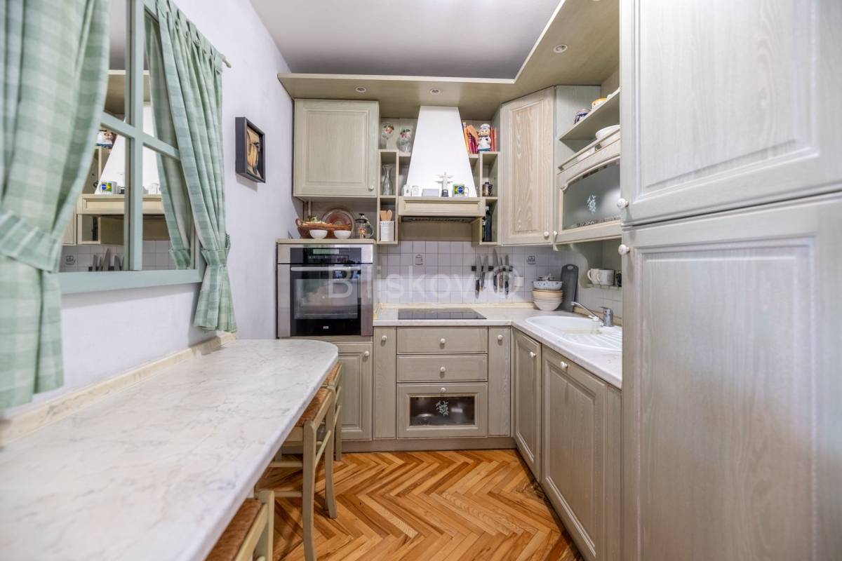 Lijep četverosoban komforan stan površine 103, 24 m2, na zadnjem katu zgrade koja je građena 1996. godine. Zgrada nema dizalo. Stan se sastoji od hodnika, dnevnog boravka koji je integriran sa kuhinjom , blagovaonicom, ostakljene i natkrivene terase, tri spavaće sobe, dvije kupaonice. Uz stan se prodaje i spremište od 4 m2 koje ima svoj vlasnički list. Terasa se nastavlja na blagovaonicu, kvadratnog je oblika i ima otvoren, prekrasan pogled na istočni dio Grada. U budućnosti , nema šanse da bi se izgradila neka građevina koja bi zaklonila ovako lijep pogled. Jedna kupaonica ima WC i tuš kabinu, a druga ima veliku kadu . Tu je i perilica i sušilica rublja. Obje kupaonice su renovirane 2023 godine. Stan se prodaje u viđenom stanju, dakle sa namjestajem i uređajima. Svi uređaji i namještaj su visoke kvalitete. Stan je okupan u svijetlu. Zgrada je građena armirano betonskim okvirom sa zidanim ispunom. Krovište je betonsko na kojem je šindra, a prije 7 godina je podaskano i stavljen je lim.