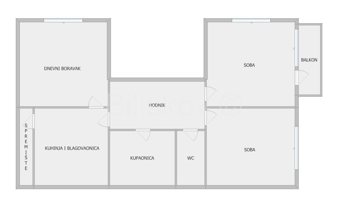 Stan se sastoji od dvije spavaće sobe, dnevnog boravka, ulaznog hodnika, kupaonice, WC-a, kuhinje sa blagovaonicom i dva balkona.