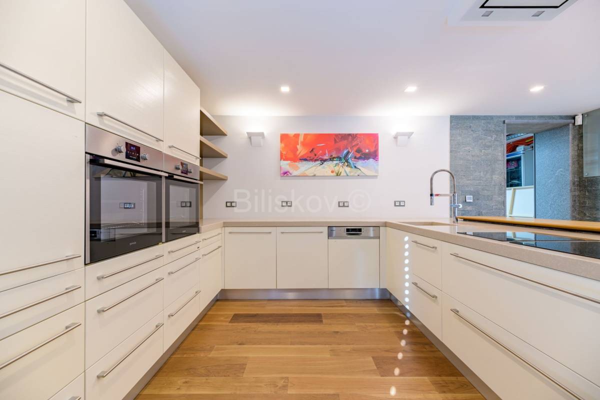 Vila se prostire na četiri etaže i uključuje tri spavaće sobe, ulazni hodnik, predsoblje, stepenište, četiri terase, tri kupaonice s WC-om, prostrani dnevni boravak otvorenog koncepta s kuhinjom i blagovaonicom, bazen, saunu i gospodarsku prostoriju. Dodatnu vrijednost pružaju uređeni vrt i tri parkirna mjesta, od kojih su dva natkrivena.