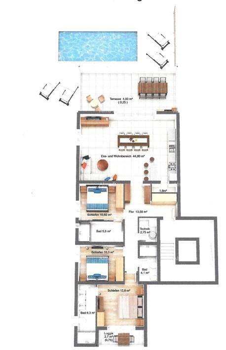 Stambena građevina uključuje 6 stambenih jedinica i dva otvorena vanjska bazena.