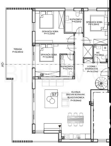 Stan se sastoji od dnevnog boravka s kuhinjom i blagovaonicom površine 39,84 m², triju spavaćih soba površina 10,26 m², 13,22 m² i 12,06 m², dvije kupaonice od 5,02 m² i 3,75 m², WC-a od 2,98 m², hodnika i stepeništa od 14,37 m² te unutarnjeg stepeništa od 2,87 m². Ima dvije terase površine 31,98 m² i 52,58 m² s pogledom na more.