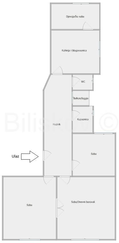 Stan se sastoji od tri prostrane prolazne sobe, kuhinje sa blagovaonicom, komforne djevojačke sobe, kupaonice, wc-a i balkona.