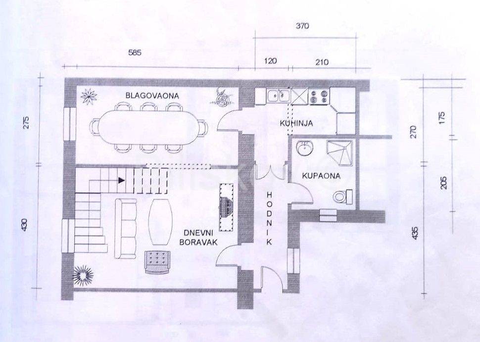 Prva etaža stana (59,72 m2) se sastoji od ulaznog hodnika, dnevnog boravka, kuhinje, blagovaonice i kupaonice s wc-om.