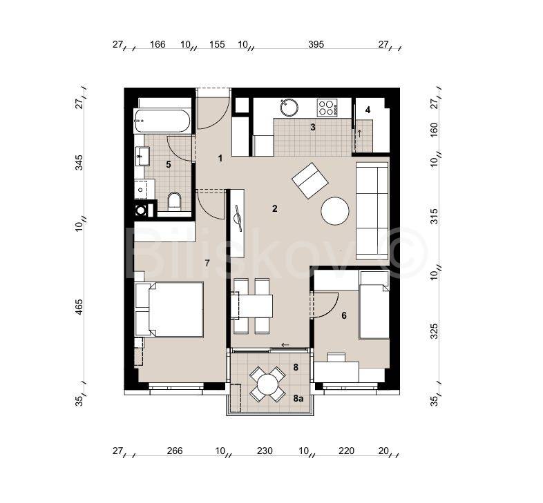 Stan se sastoji od ulaznog prostora, „open space“ dnevnog boravka kuhinje i blagovaonice s izlazom na loggiu, dvije spavaće sobe, kupaonice i ostave.
