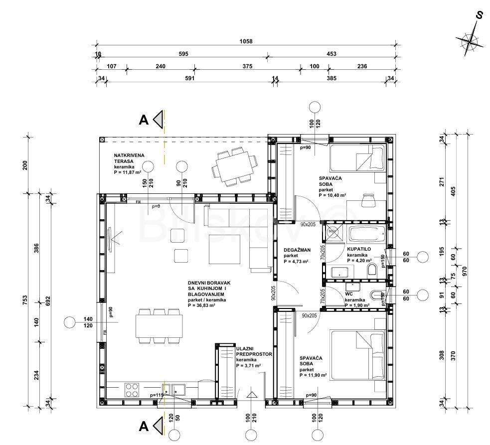 Sastoji se od ulaznog predprostora, kupaonice, WC-a, degažmana, natkrivene terase, dvije spavaće sobe te otvorenog koncepta kuhinje, dnevnog boravka i blagovaonice.