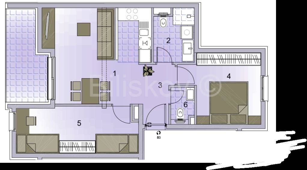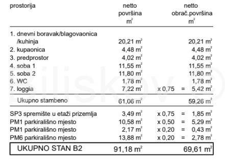Ukupna površina stana iznosi 69,61 m², od čega je stambeni dio 59,26 m².