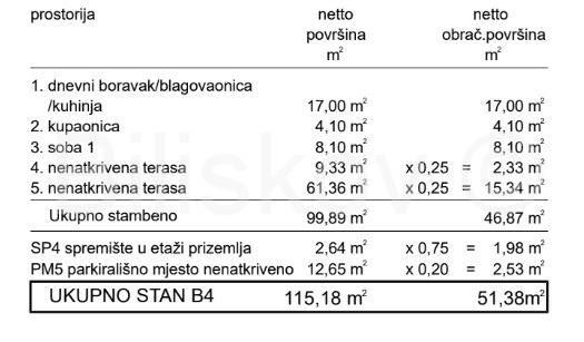 Ukupna površina stana iznosi 51,38 m², od čega je stambeni dio 46,87 m².