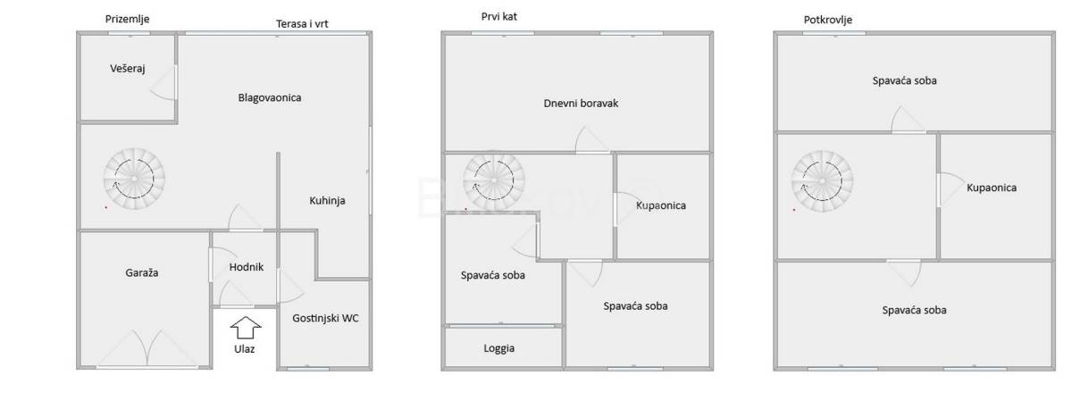 U prizemlju se nalaze kuhinja integrirana sa blagovaonicom i izlazom na tersau i u vrt, gostinjski wc, vešeraj i garaža površine 13,44 m2. Kružne stepenice vode na kat na kojem se nalaze dnevni boravak, dvije spavaće sobe i kupaonica. U potkrovlju se nalaze dvije spavaće sobe i kupaonica.