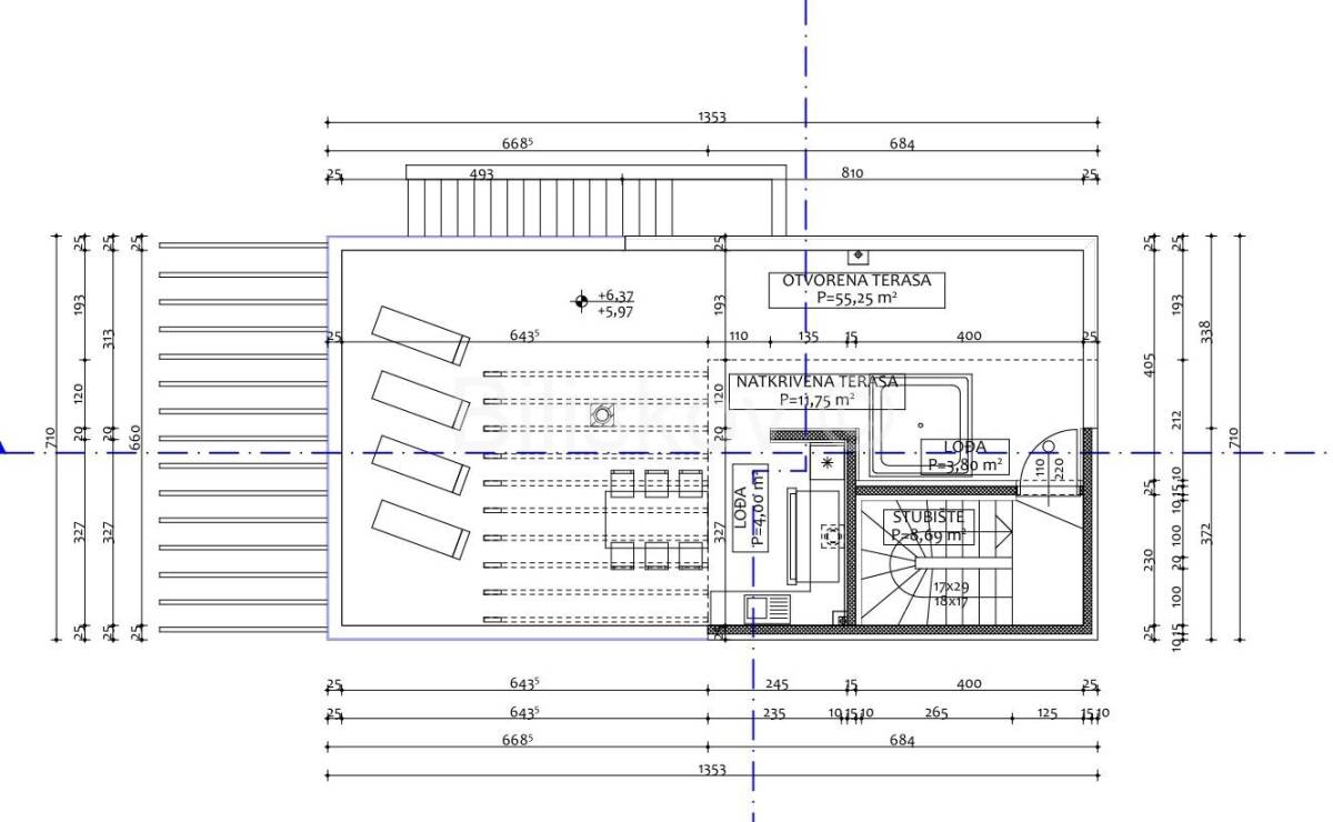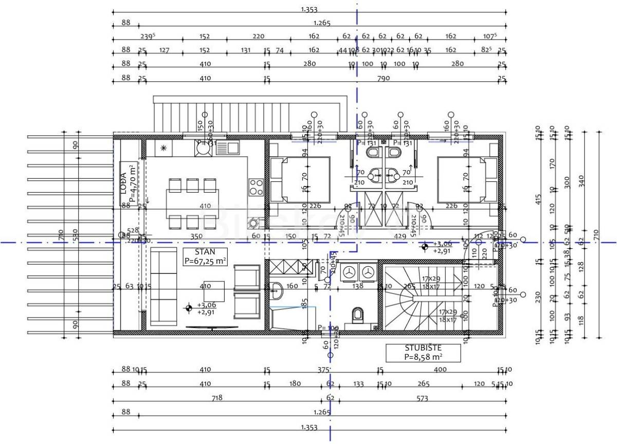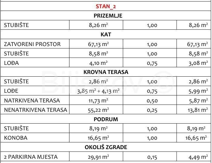 Izvanredan dvoetažan trosobni apartman, obračunske stambene površine 145 m², smjestit će se na prvom katu i krovu moderno projektirane zgrade. Nekretnina se sastoji od stana površine 67 m², krovne terase od 67 m², dva parkirna mjesta ukupne površine 30 m², stubišta površine 20 m², konobe površine 17 m2, te tri lođe površina 12m².