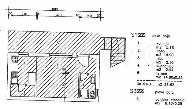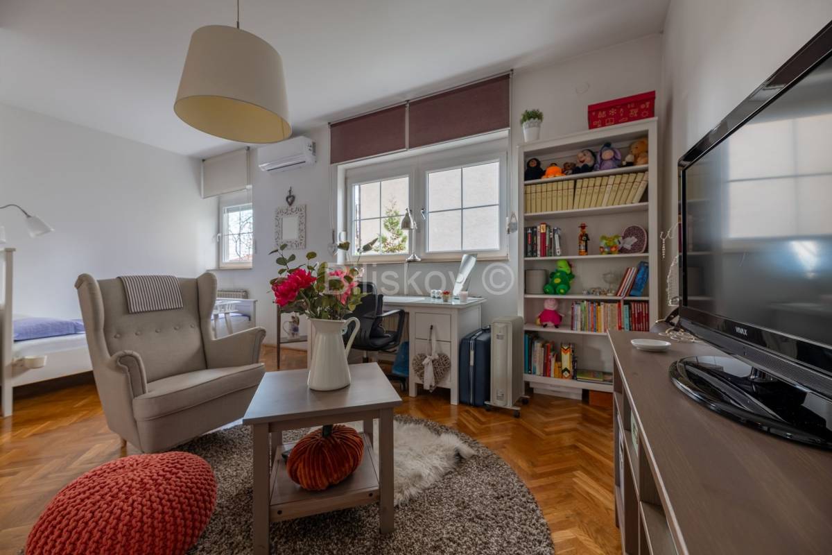 - U prizemlju je garsonjera od 28,82m2, koja može služiti kao izvor prihoda od iznajmljivanja, ured i slično. Ona ima pristup zelenoj površini (cca 50m2), koja pripada stanu.