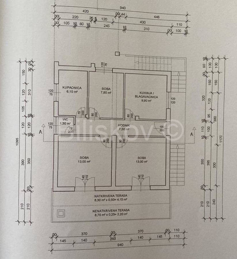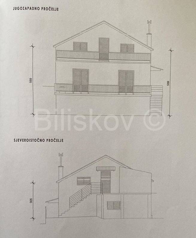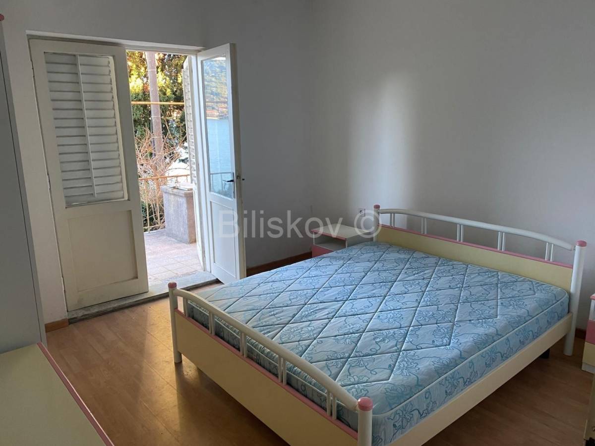 Samostojeća četverosobna kuća neto površine 87 m², sagrađena 1970. godine, smještena je u prvom redu do mora na parceli veličine 233 m². Posljednja adaptacija izvedena je 1994. godine.