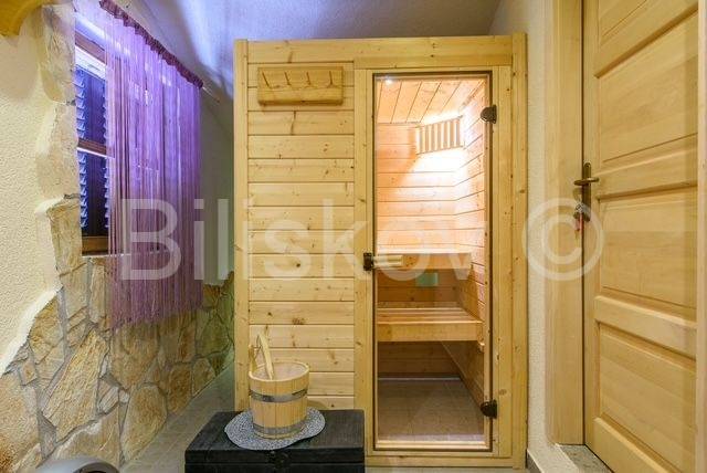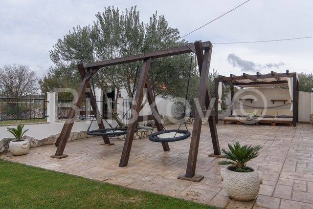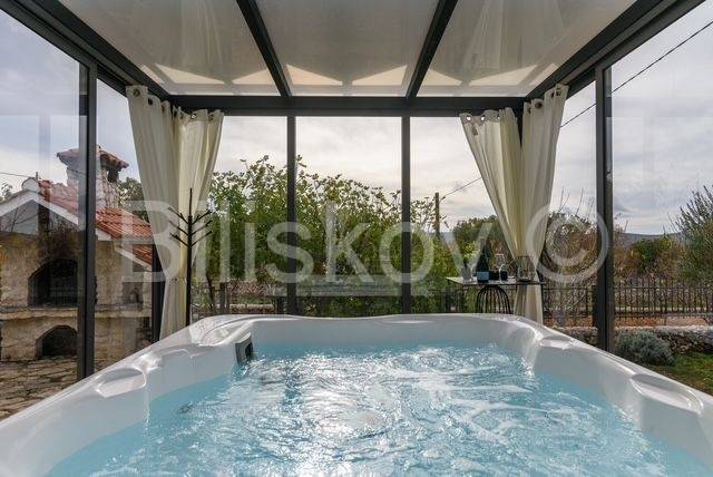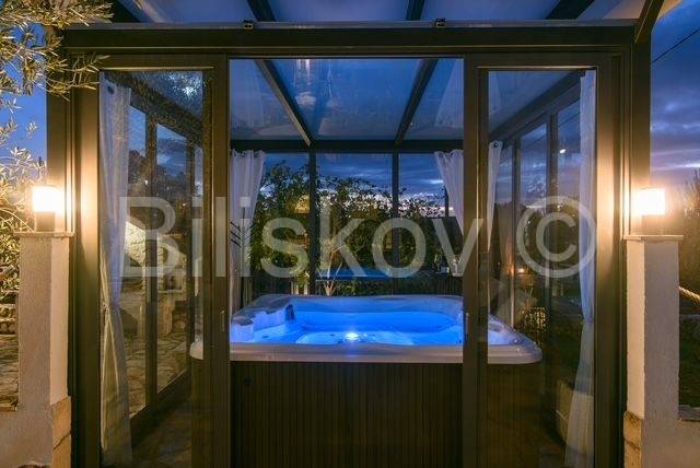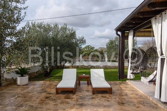 Vanjski prostor nudi grijani bazen, jacuzzi i saunu, veliku terasu, roštilj i sportske sadržaje poput biljara, stolnog tenisa i trampolina, okružen uređenim vrtom s maslinama.