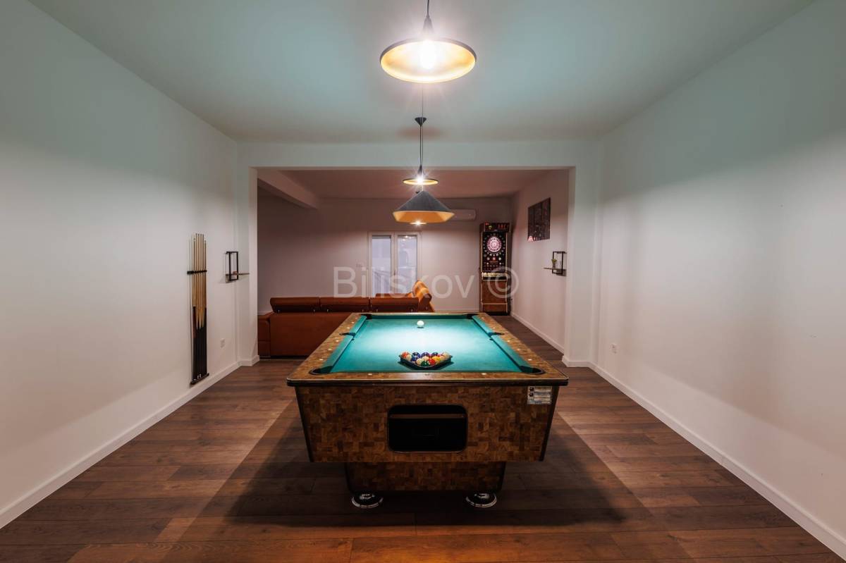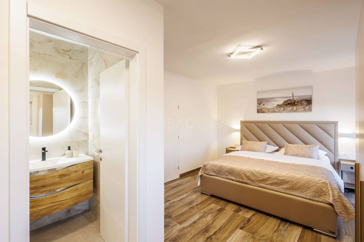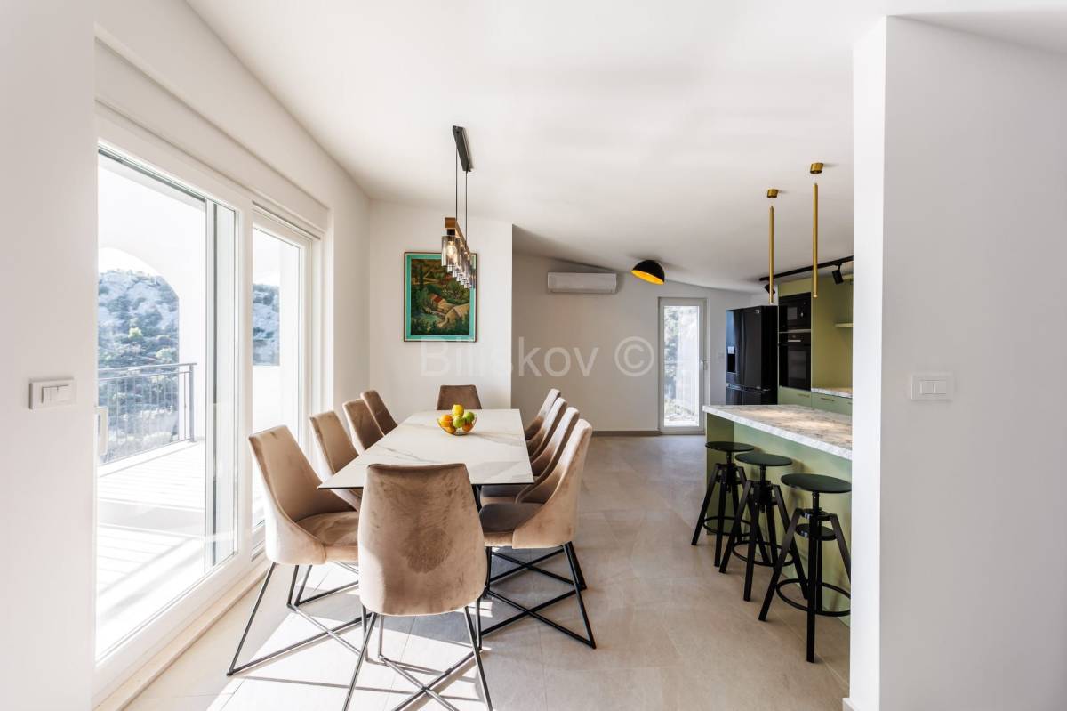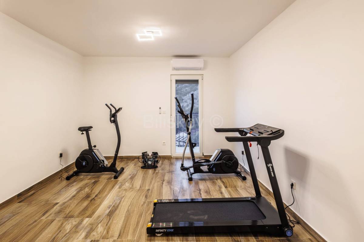 U prizemlju se nalazi dvosobni apartman i podrum, dok se na prvom katu nalaze tri sobe, vešeraj i igraonica. Drugi kat nudi prostor predviđen za saunu, dvije sobe i teretanu, a na trećem katu smješteni su dnevni boravak i kuhinja s izlazom na prostranu terasu. Sve prostorije u kući imaju izlaz na balkon s prekrasnim pogledom na more.