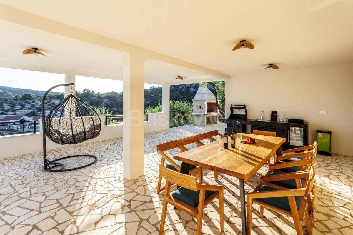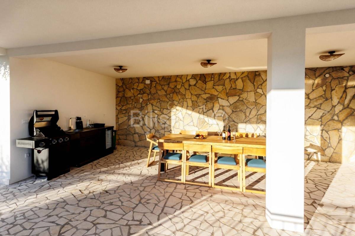 Okućnica je uređena i obogaćena brojnim sadržajima, među kojima se ističu vanjski bazen površine 33 m2, jacuzzi, vanjska kuhinja s grilom i kaminom te igralište. Na raspolaganju je i parking površine približno 200 m². Kuća posjeduje vlastiti bunar, dok je priključak na vodovod planiran do ljeta.
