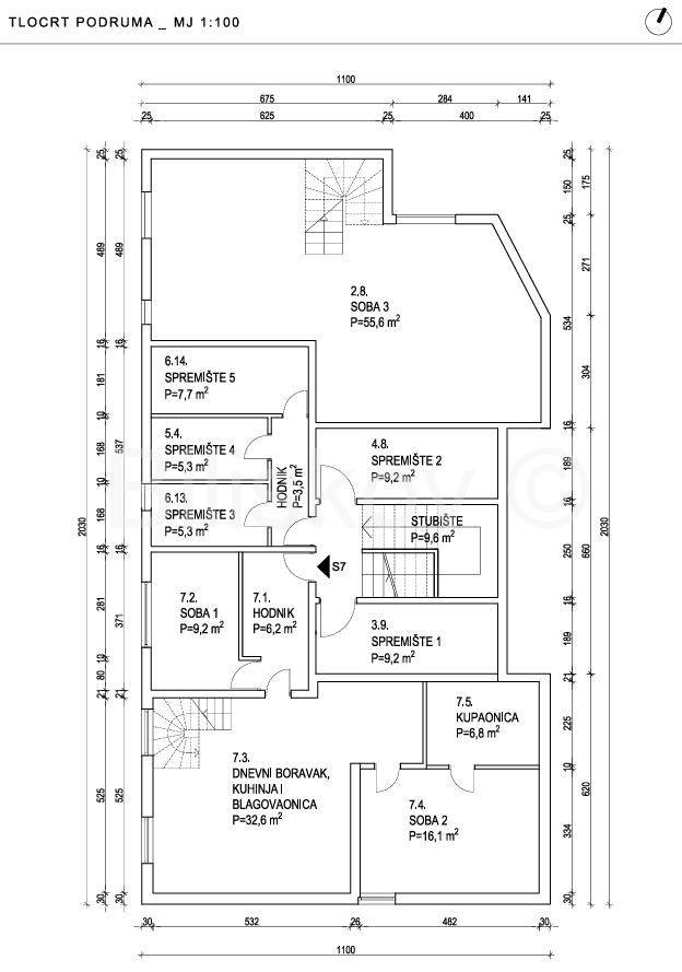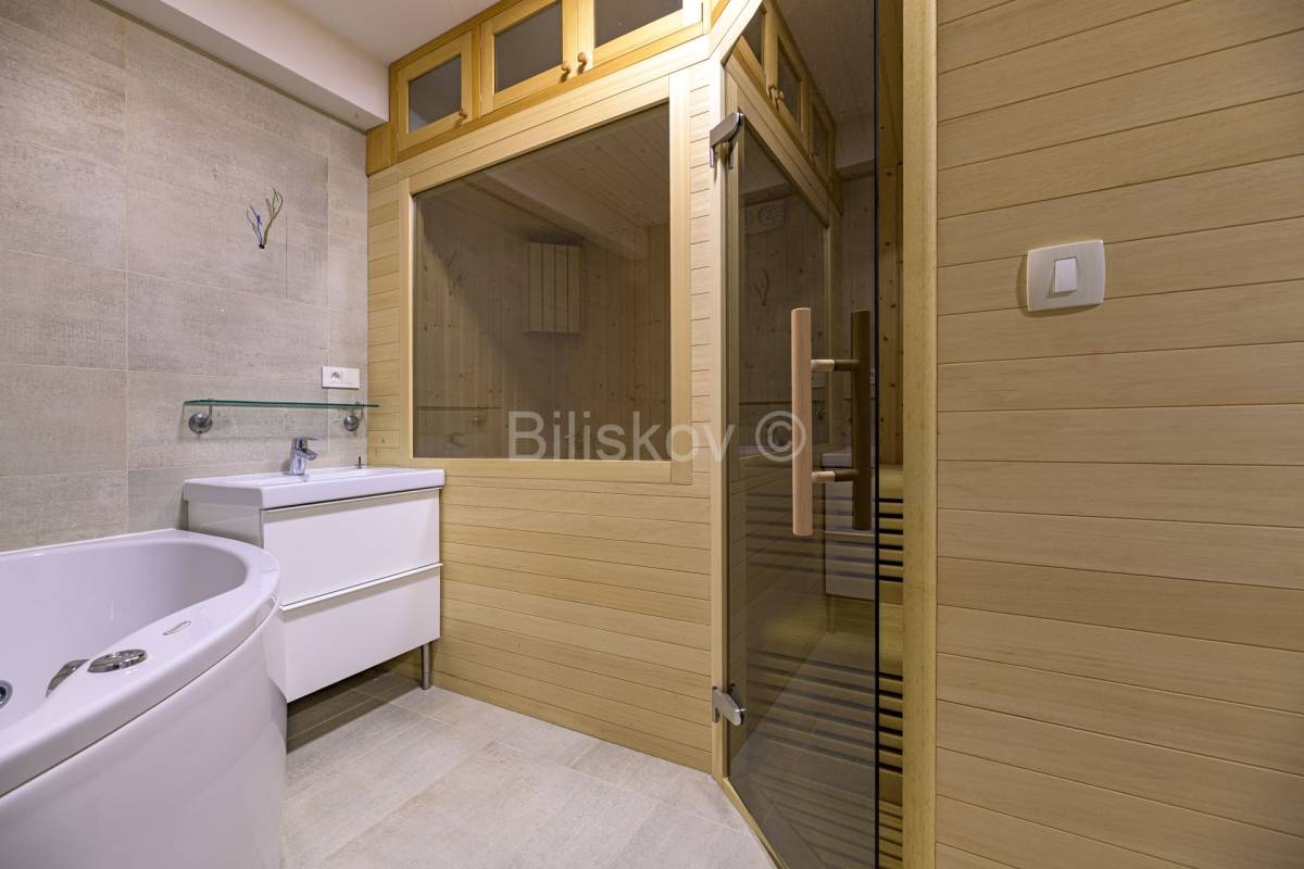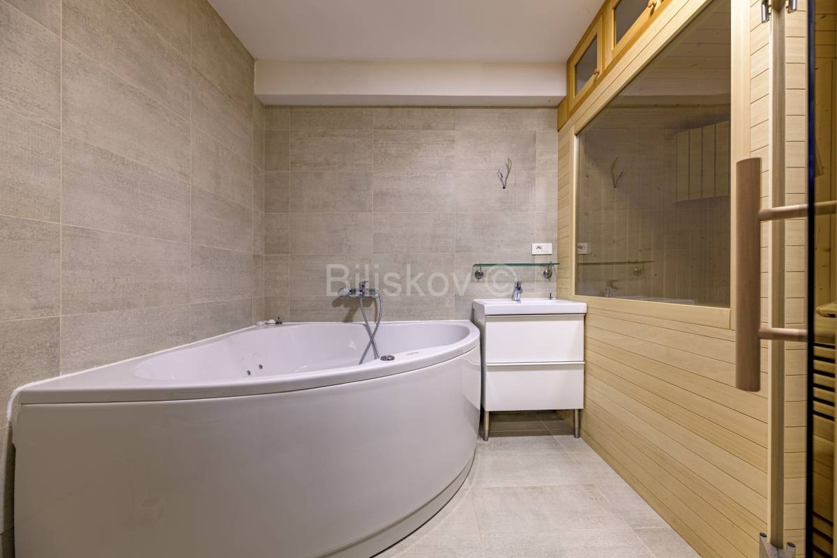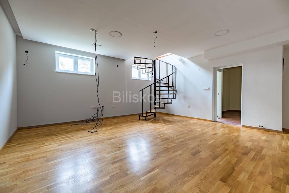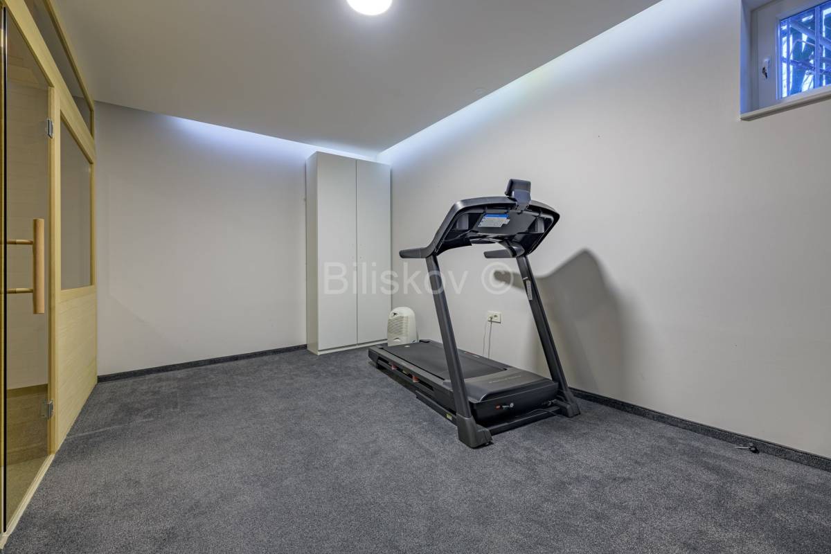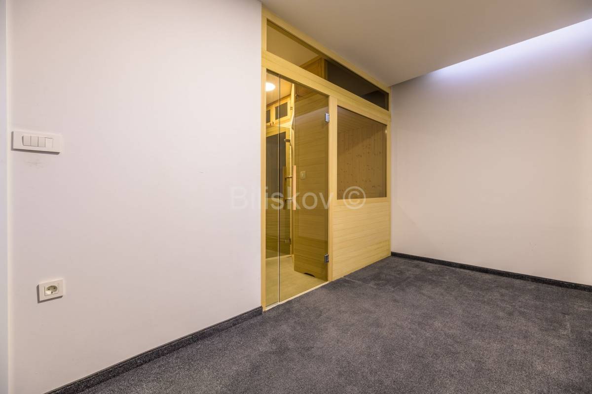 Podrumski dio stana obuhvaća hodnik, kupaonicu, fitnes sobu, prostoriju sa saunom i jacuzzijem te dodatni dnevni boravak.