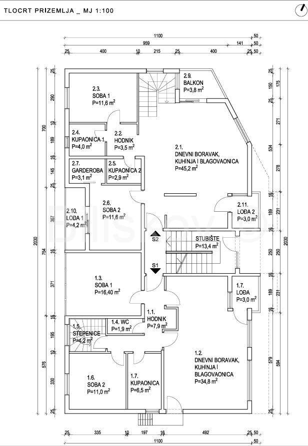 Prizemlje se sastoji od hodnika, dvije spavaće sobe, dvije lođe, kupaonice s WC-om, dnevnog boravka i kuhinje otvorenog koncepta te velikog vrta.