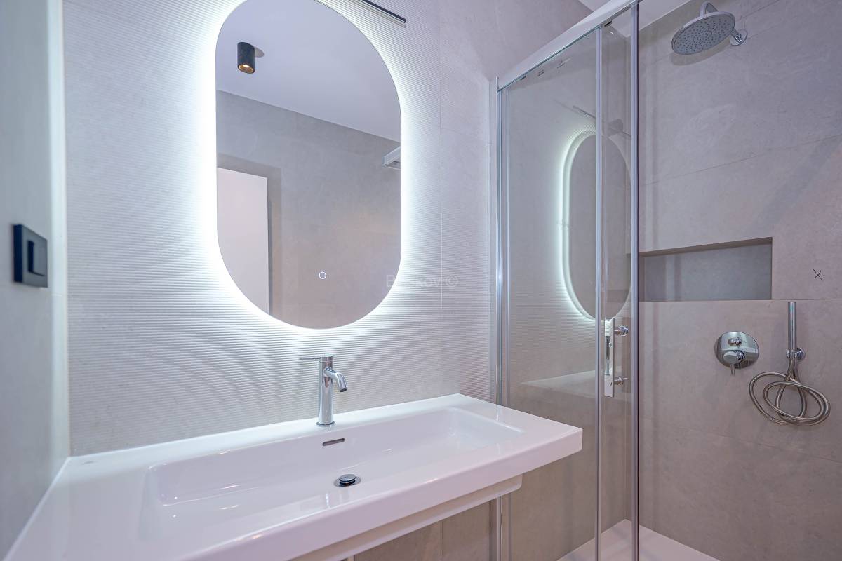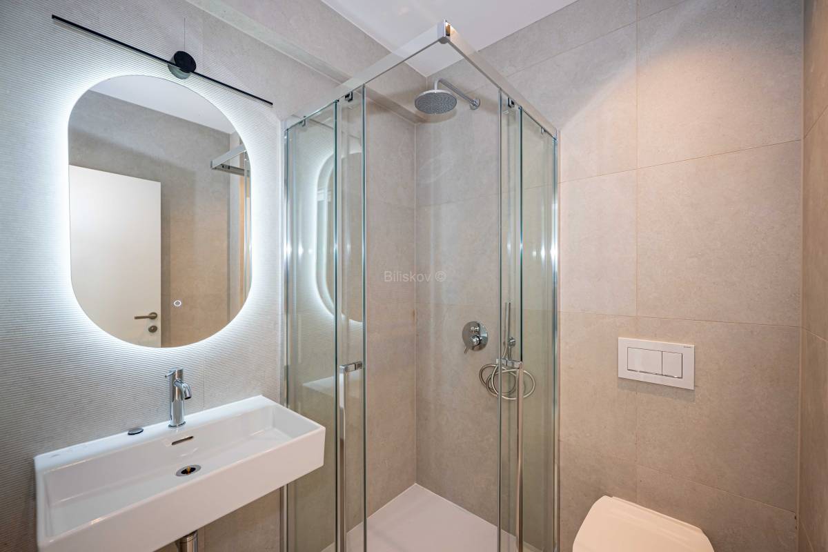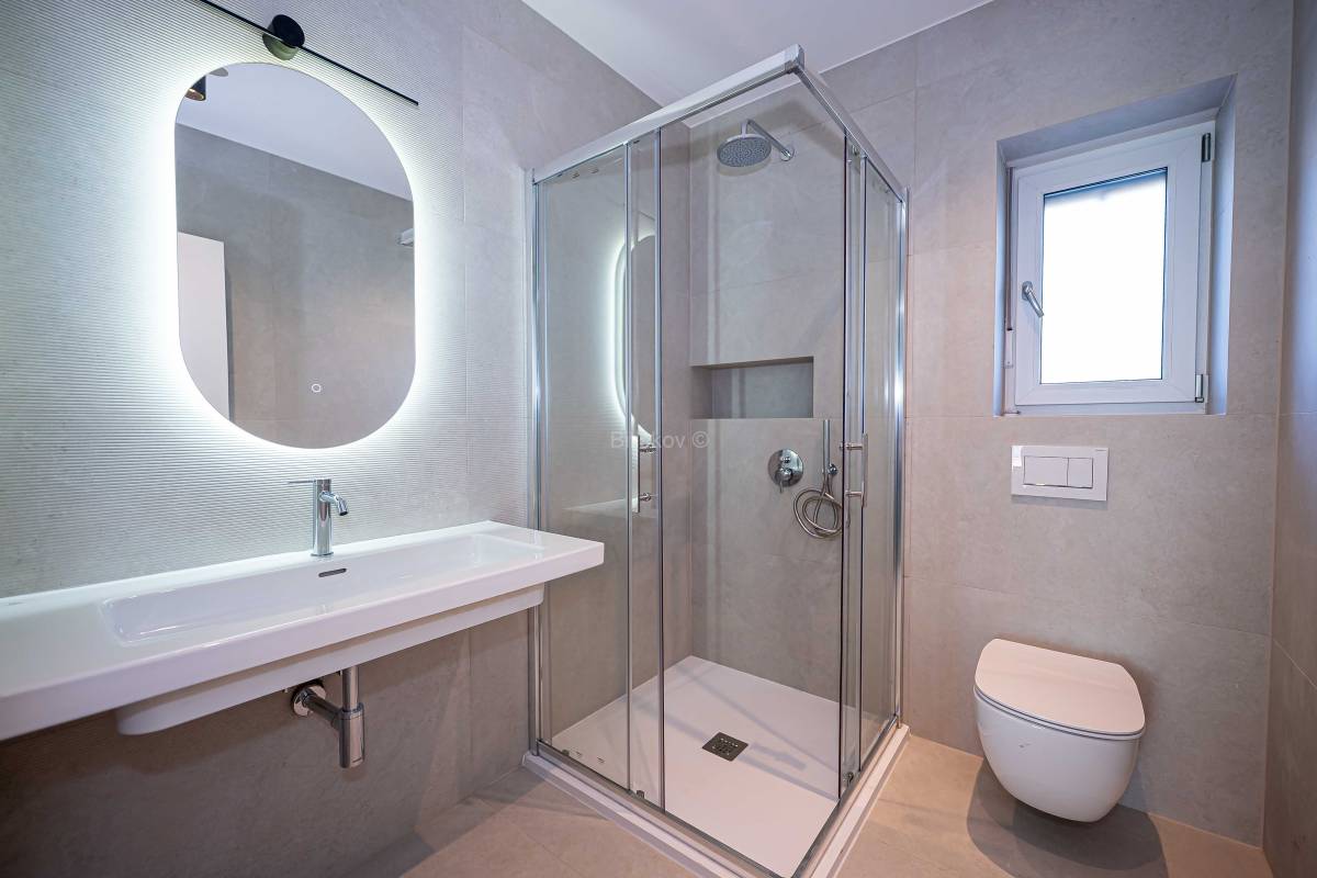 Sva sanitarna oprema je visoke kvalitete poznatih proizvođača. Opremu čine: konzolni umivaonici s pripadajućim miješalicama, konzolna WC školjka s poklopcem i s niskošumnim ugradbenim vodokotlićem, tuš – kada s tuš setom. Priključak za perilicu rublja s odvodnjom.