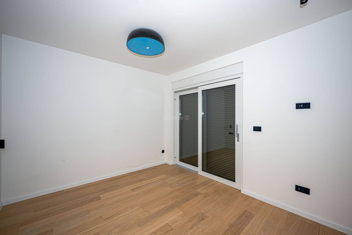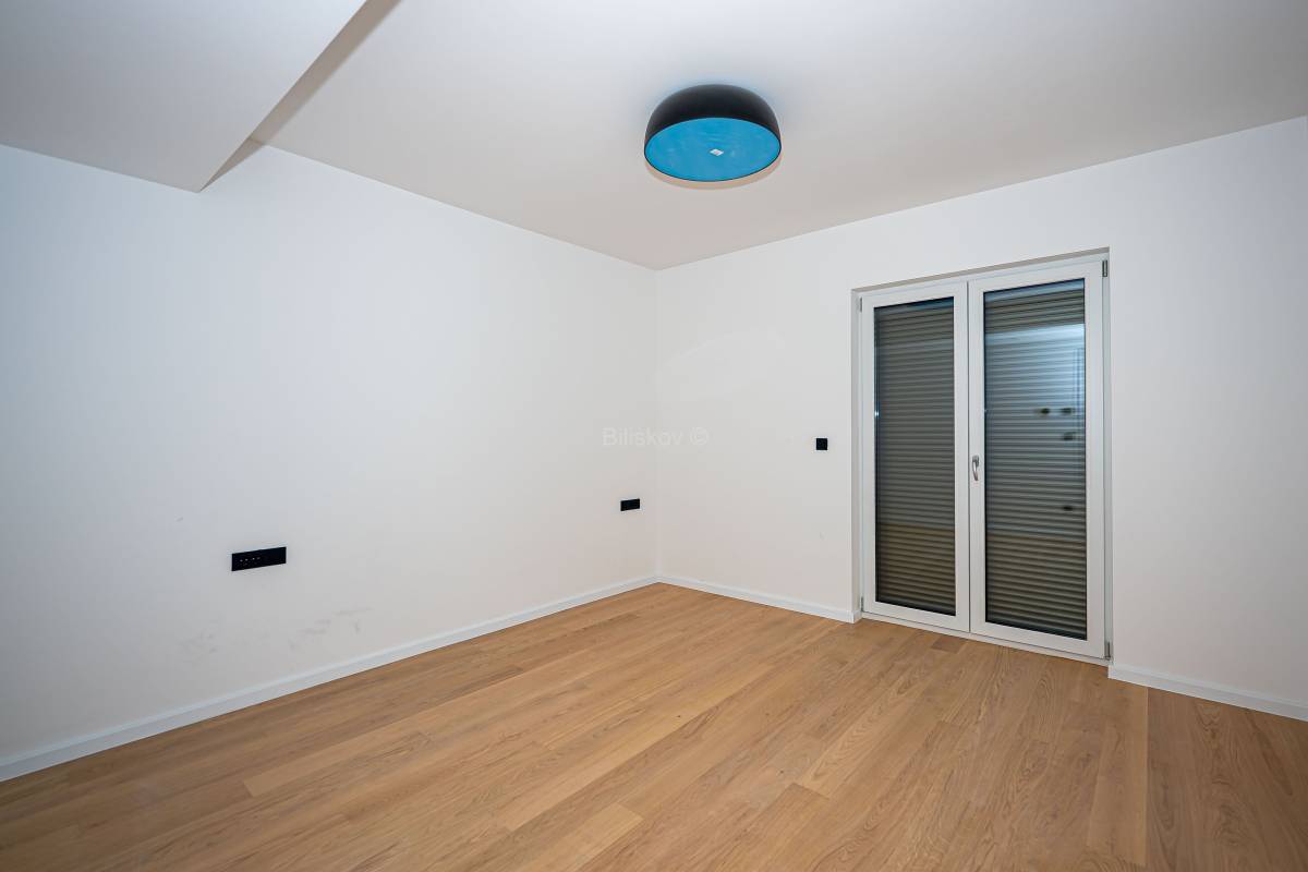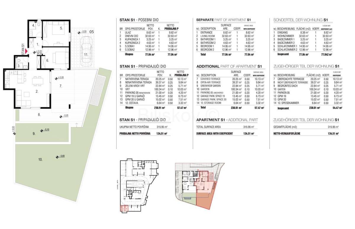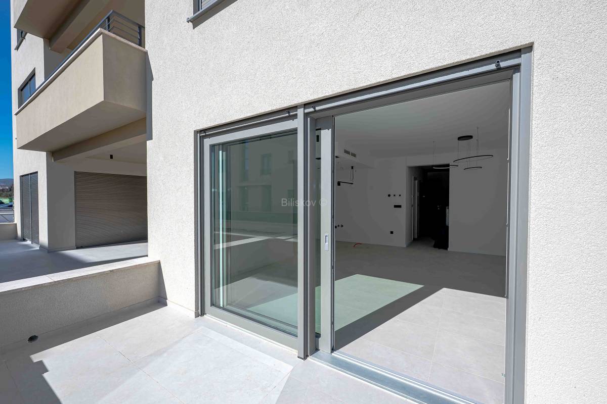 Stan se nalazi u prizemlju, ukupne površine 139mm², od čega je 77,04 m² stambenog prostora. Raspored stana uključuje kuhinju s blagovaonicom i dnevnim boravkom, dvije sobe, dvije kupaonice, ostavu, terasu te vrt. Uz stan dolazi jedno vanjsko te 2 garažna mjesta.