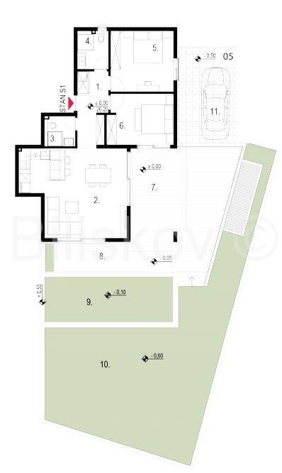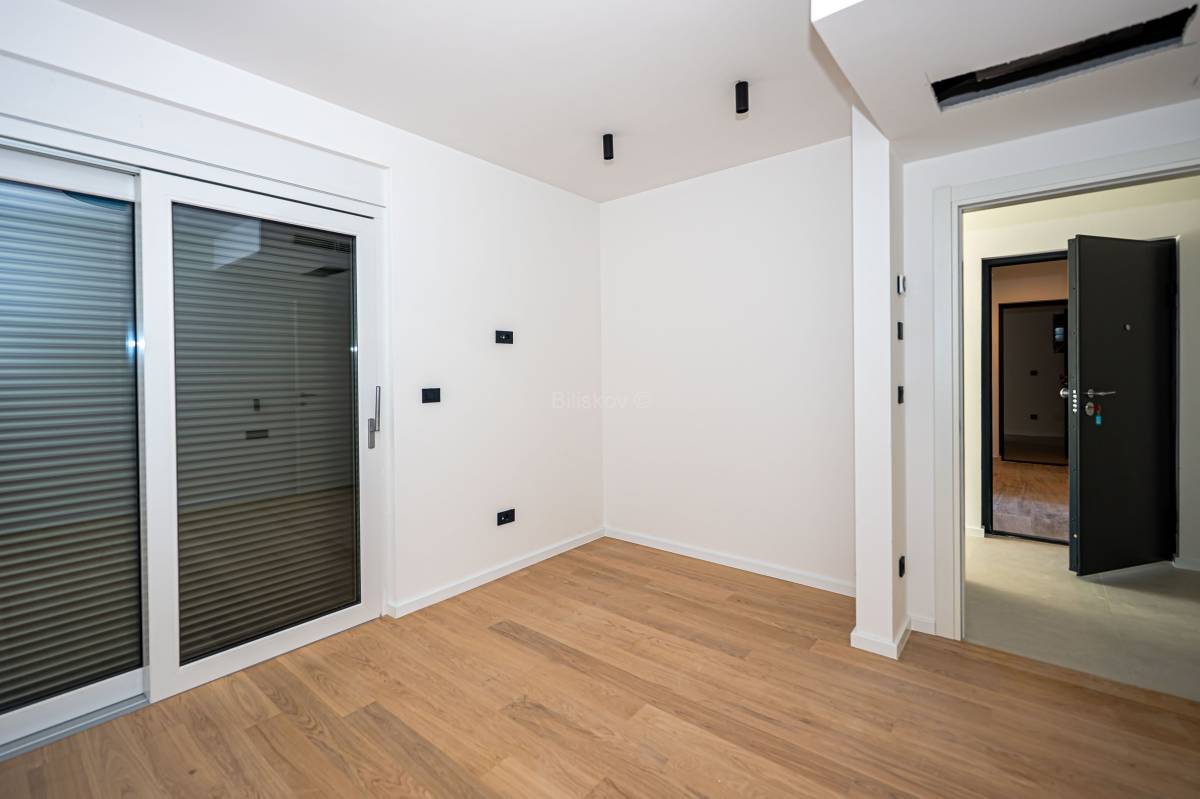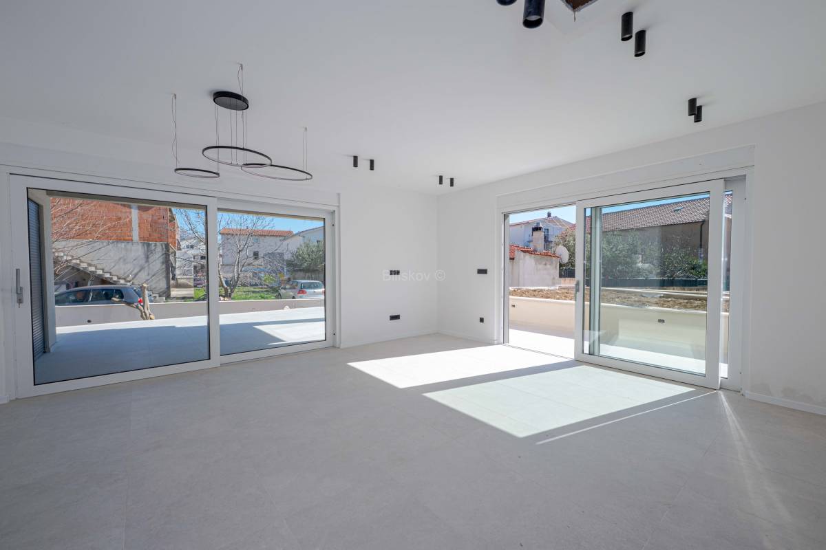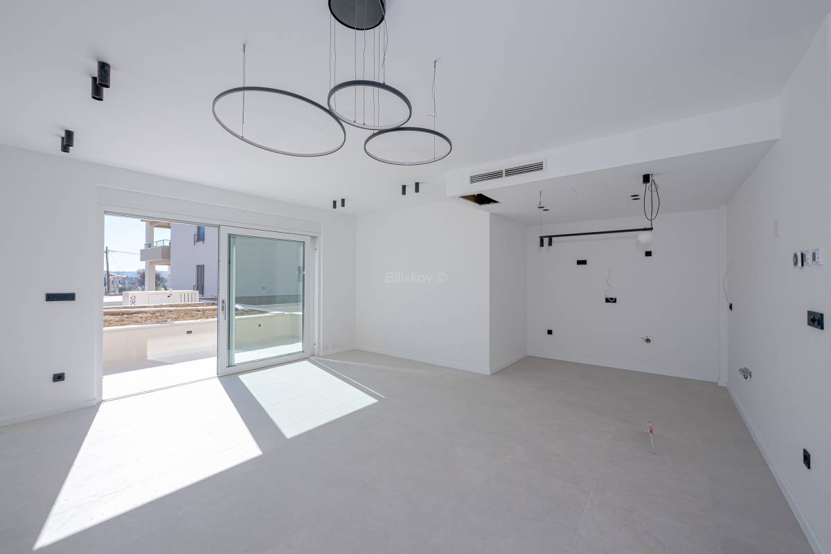 Stan se nalazi u prizemlju, ukupne površine 139mm², od čega je 77,04 m² stambenog prostora. Raspored stana uključuje kuhinju s blagovaonicom i dnevnim boravkom, dvije sobe, dvije kupaonice, ostavu, terasu te vrt. Uz stan dolazi jedno vanjsko te 2 garažna mjesta.
