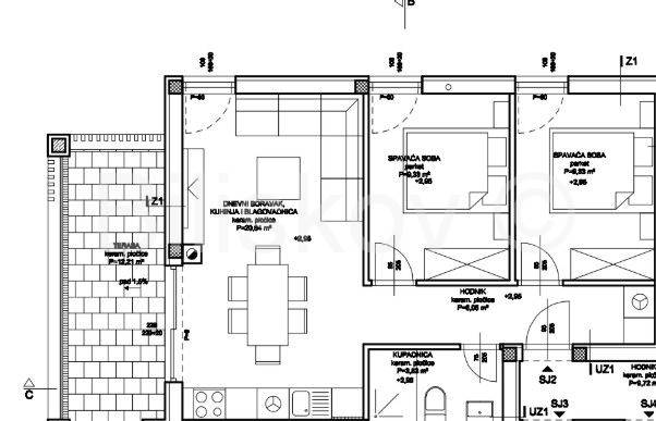 Stan se sastoji od dvije spavaće sobe, kuhinje s blagovaonicom i dnevnim boravkom, kupaonice, terase od 12,21 m² te parkirnog mjesta od 3,75 m². Na vrhu zgrade nalazi se zajednička krovna terasa, idealna za opuštanje i uživanje u pogledu.