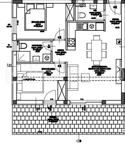 Stan se sastoji od dvije spavaće sobe, kuhinje s blagovaonicom, dvije kupaonice, terase od 18,55 m², dvorišta od 21 m² te parkirnog mjesta od 3,75 m². Na vrhu zgrade nalazi se zajednička krovna terasa, idealna za opuštanje i uživanje u pogledu.