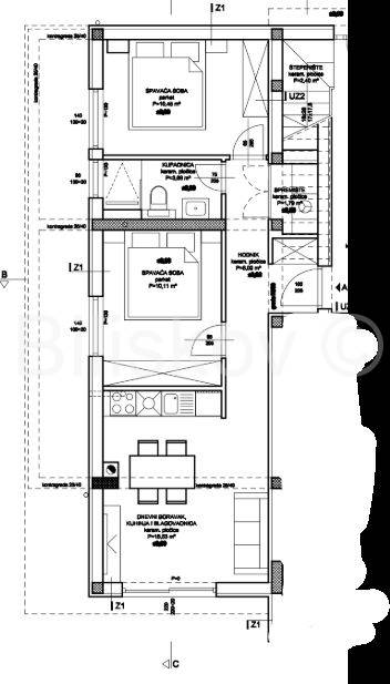 Stan se sastoji od dvije spavaće sobe, kuhinje s blagovaonicom i dnevnim boravkom, kupaonice, spremišta, terase od 10,50 m², dvorišta od 7,5 m² te parkirnog mjesta od 3,75 m². Na vrhu zgrade nalazi se zajednička krovna terasa, idealna za opuštanje i uživanje u pogledu.