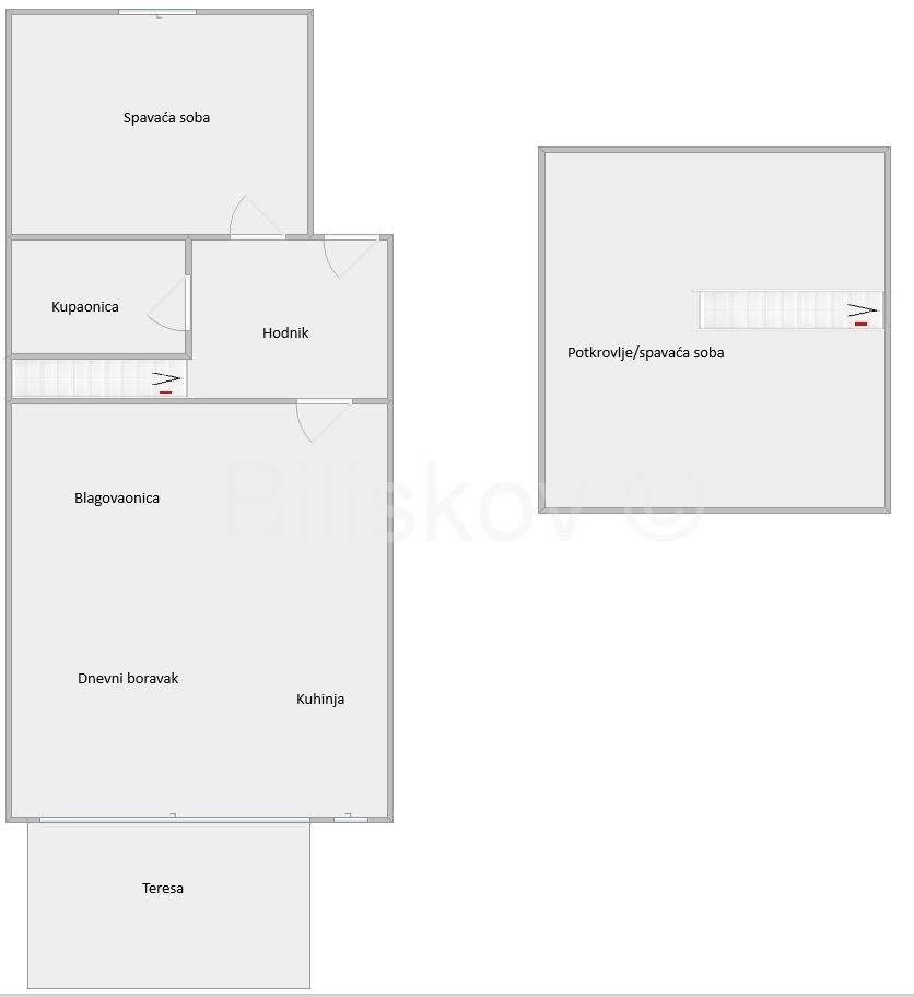 Dvoetažni trosoban stan površine 70,90 m2 na 1.katu i u potkrovlju manje stambene zgrade sagrađene 1981.g.