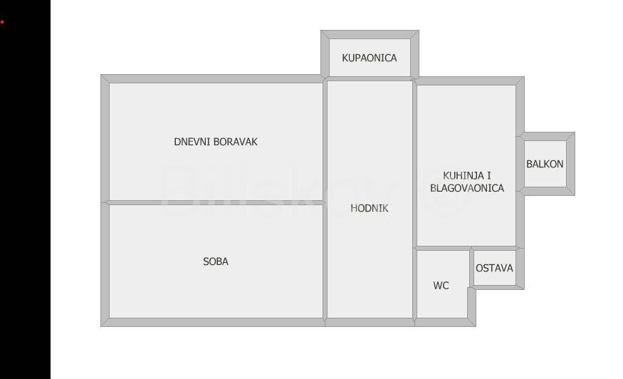 Stan se sastoji od dnvevnog boravka, spavaće sobe, kuhinje s blagovaonicom, kupaonice, WC-a, ostave, hodnika i balkona.
