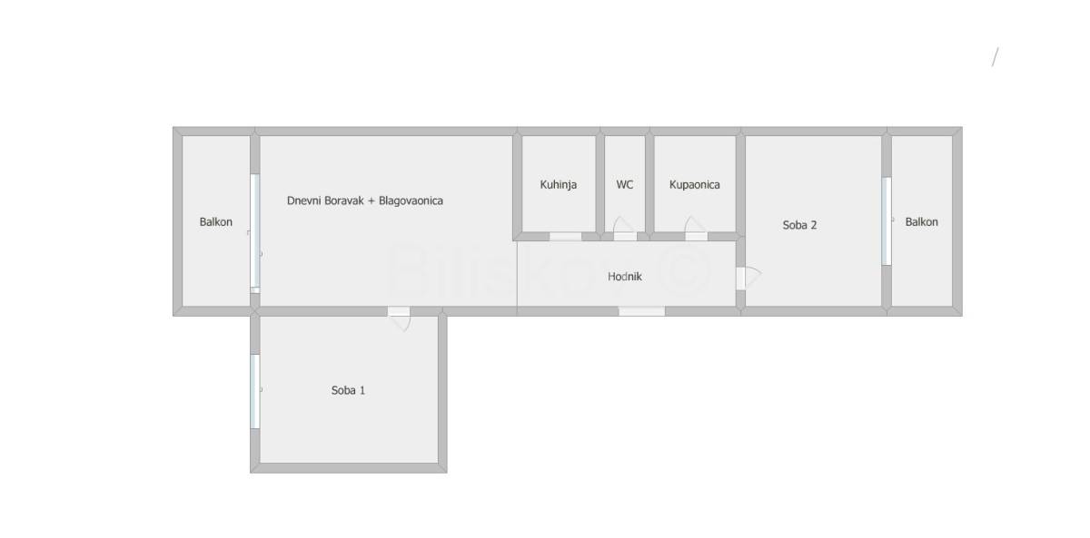 Stan se sastoji od ulaznog hodnika, dnevnog boravka s blagovaonicom i izlazom na loggiu, kuhinje, 2 spavaće sobe od kojih jedna ima izlaz na loggiu, kupaonice, wca i ostave.