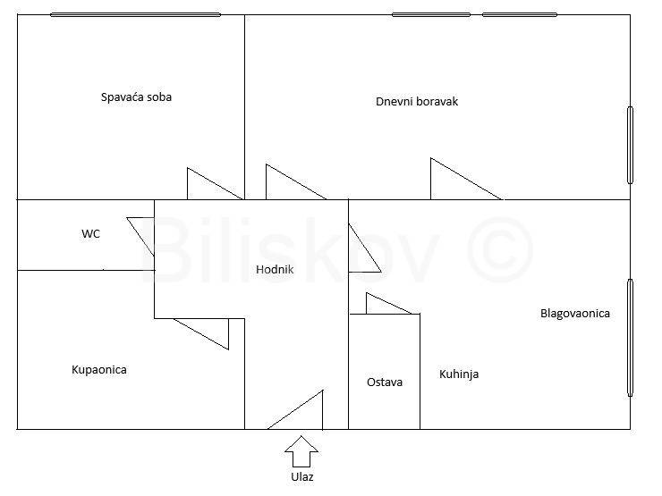Tlocrt stana je vrlo lijepo razveden, te se malom intervencijom može vrlo lako dobiti još jedna spavaća soba, a da se pri tom ne izgubi širina dnevnog boravka.