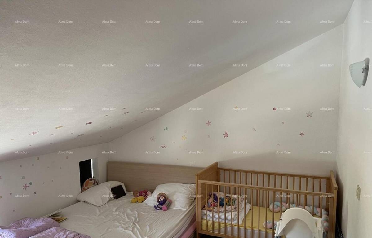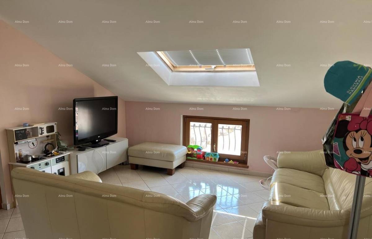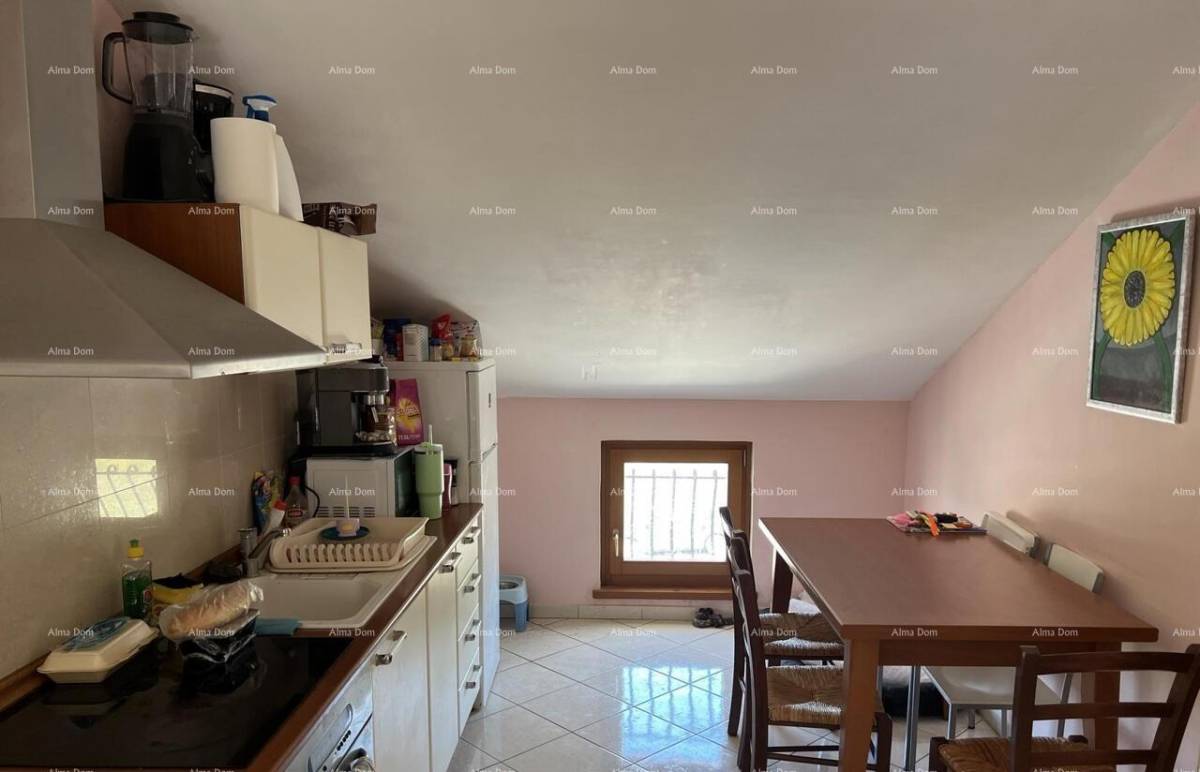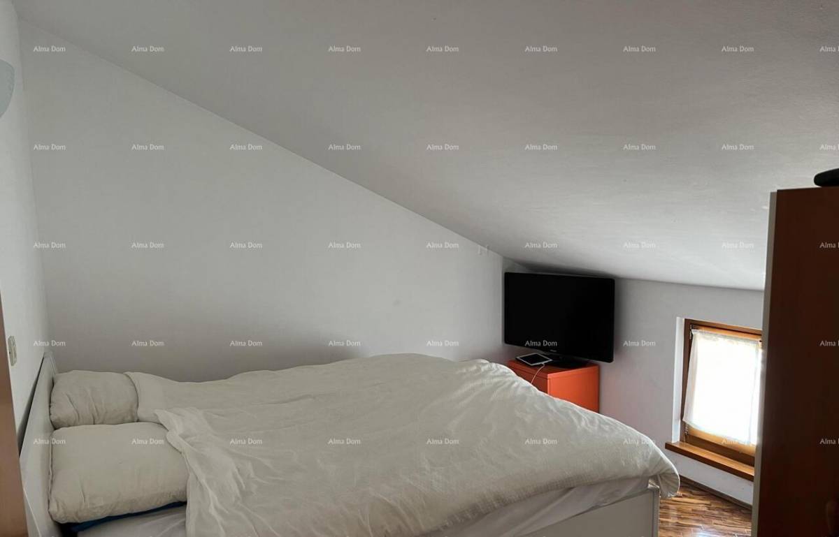 Stan je mansardni na 1. katu s pogledom na more. Sastoji se od 2 spavaće sobe, renovirane i velike kupaonice, kuhinje i dnevnog boravka. Stanu pripada i okolni prostor u kojem se nalazi zajednički bazen (prednost su niski ukupni troškovi održavanja), vlastiti parking, roštilj i vrtna kućica. Stan se prodaje namješten.