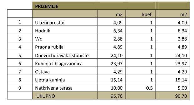 Kuća se sastoji u prizemlju (površine 95,7 m2, neto 90,70 m2) od: ulaznog prostora, hodnika, dnevnog boravka, kuhinje, blagovaonice, WC, ostave, praone rublja, ljetne kuhinje i natkrivene terase.