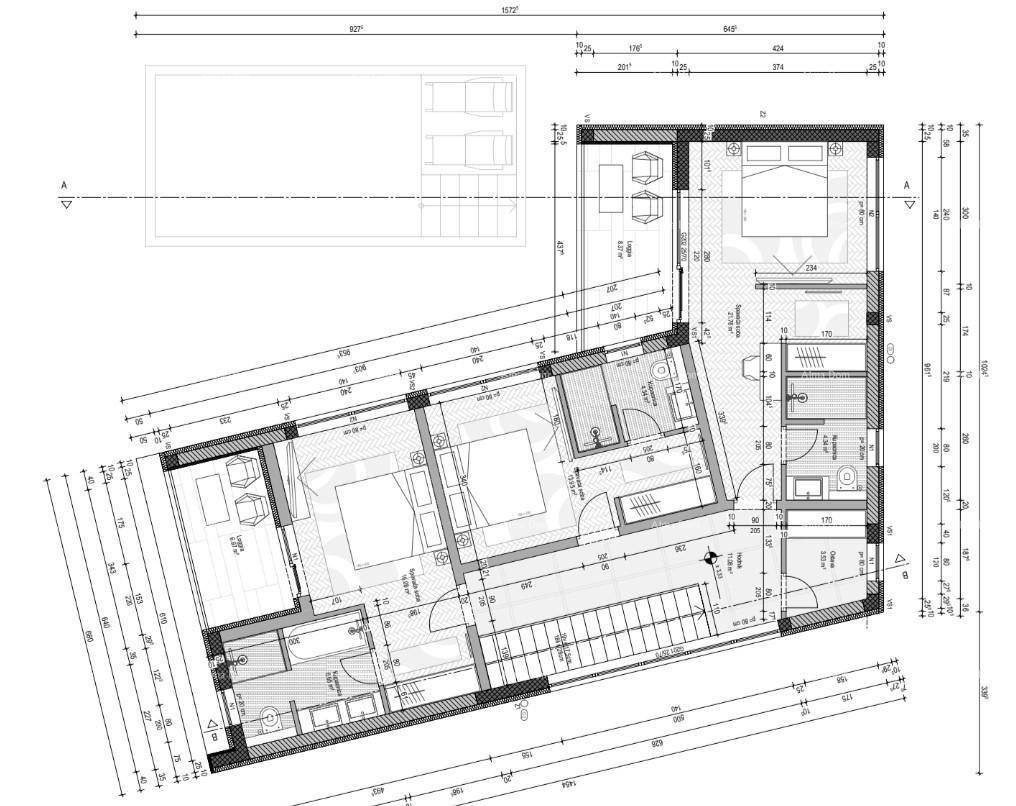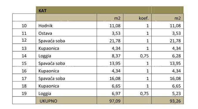 Kat (površine 97,09 m2, neto 93,26 m2) se sastoji od: hodnika, ostave, 3 spavaće sobe, 3 kupaonice i 2 loggia-e.