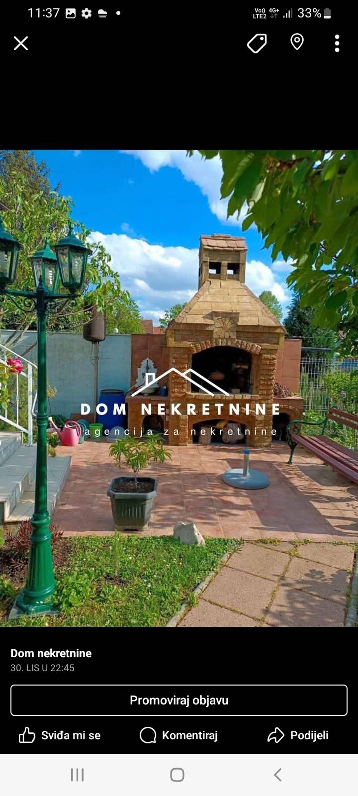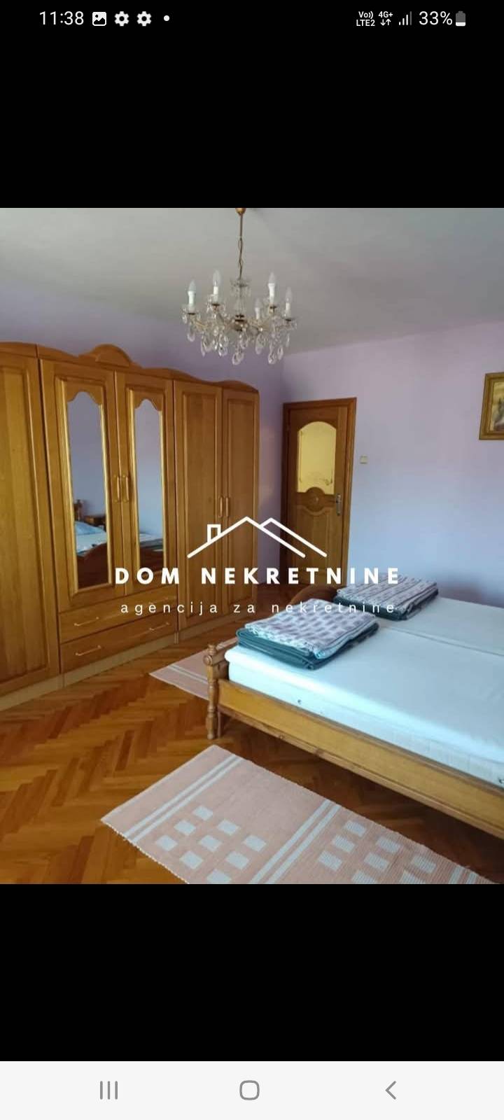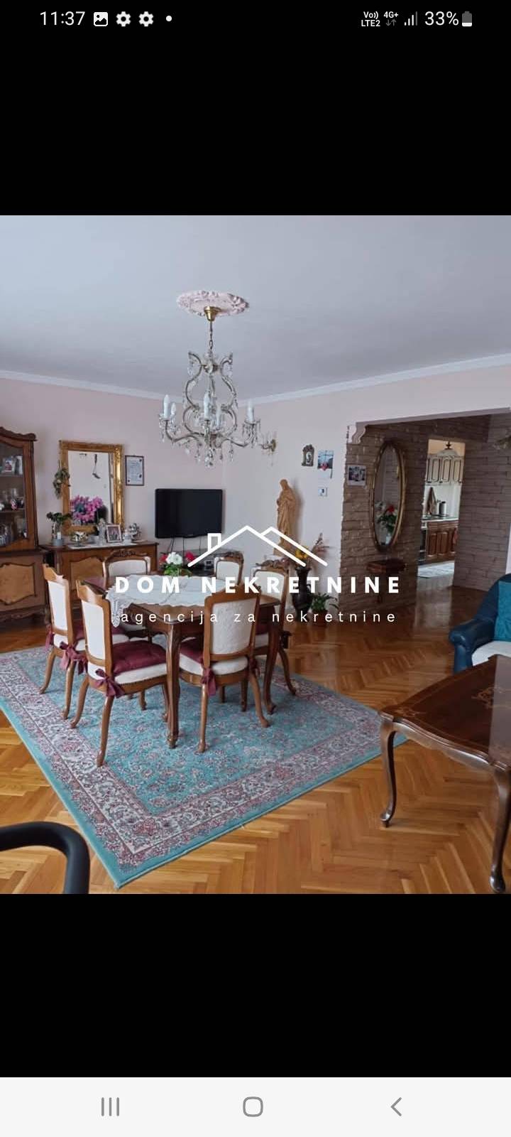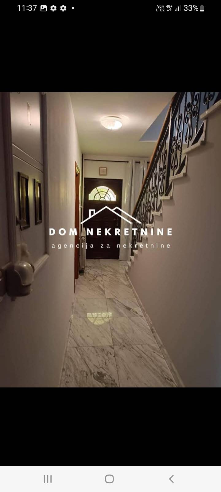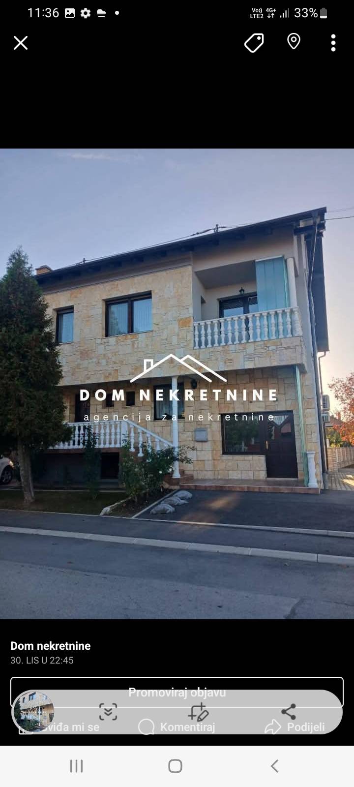Prodaje se kuća stambene površine 324 m2 u mirnom i prekrasnom naselju. U kući nisu potrebna nikakva ulaganja, potpuno je namještena i prodaje se sa namještajem. 7 soba, velika dnevna soba, kuhinja, 2 nova kupatila, velika terasa, velika garaža iz koje se ulazi u kuću, dvorište, roštilj. U prizemlju se nalazi i poslovni prostor. Podrum 84.5 m2. Postavljen je novi krov i nova fasada. Parket u cijeloj kući. Centralno grijanje. 5 parkirnih mjesta.