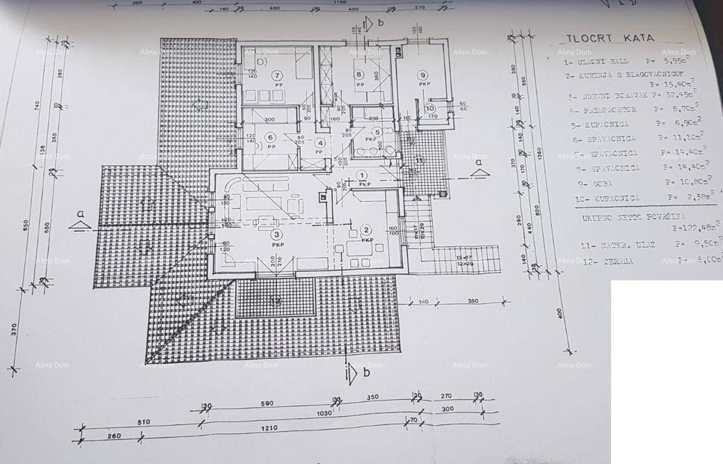 Na kat se ide vanjskim stepeništima. Na 1. katu se nalazi kuhinja s blagovaonicom, dnevni boravak, 3 spavaće sobe i 2 kupaonice, soba.
