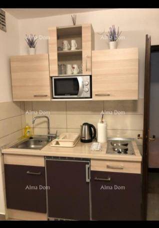 Stan se nalazi na prvom katu stambene zgrade s ukupno tri kata i ima 30 m² stambene površine. Funkcionalno je raspoređen te se sastoji od prostrane glavne prostorije u kojoj se nalaze kuhinja, blagovaonski stol i bračni krevet, manje sobe s krevetom za jednu osobu, kupaonice te lođe.