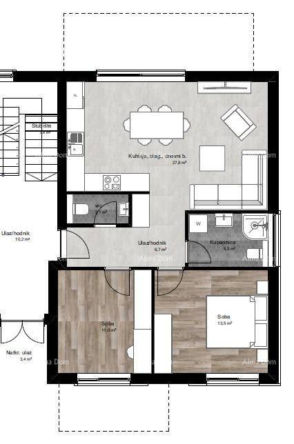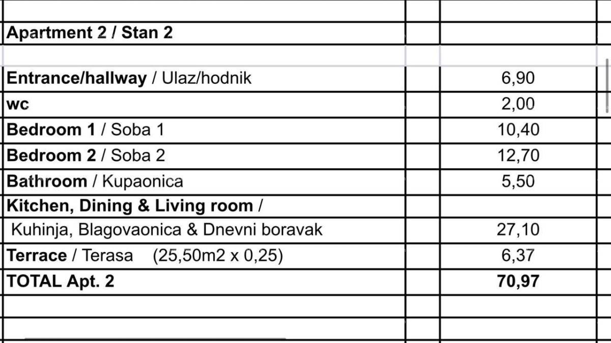 Stan se sastoji od ulaznog hodnika, dnevnog boravka+kuhinja+blagovaona, 2 spavaće sobe, kupaonice, WC i terase.