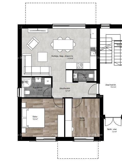 Stan se sastoji od ulaznog hodnika, dnevnog boravka+kuhinja+blagovaona, 2 spavaće sobe, kupaonice, WC i terase.