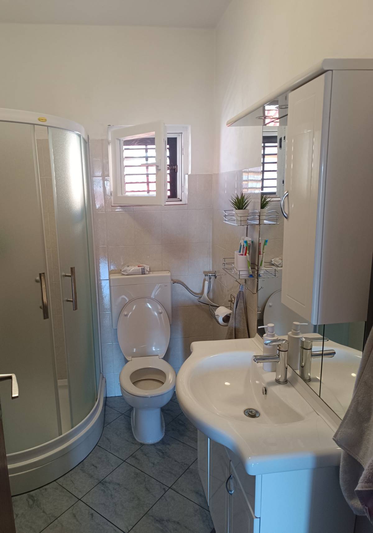 Prodaje se stan na prvom katu u privatnoj kući,(zaseban stan u prizemlju je prodan).Sastoji se od 3 spavaće sobe, prostranog hodnika, kupaone sa WC-om, predsoblja te otvorenog koncepta kuhinje, blagovaone i dnevnog boravka. Stan je renoviran 2021.godine i kompletno je namješten . Etažiran , ima zasebne priključke(struja,voda, kanalizacija) i uredno vlasništvo.Posjedujemo sve dozvole i elaborate Istom pripada i potkrovlje u roh-bau izvedbi površine 102,67m2 sa mogućnošću uređenja još jedne stambene jedinice.Ima svoje vlastito dvorište sa dva parkirna mjesta,te natkriveno stubište. Uz kuću se nalazi vrt, komin,konoba sa sanitarnim čvorom,prostorija za vešeraj +ostava.Stan je u neposrednoj blizini vrtića, ambulante,ljekarne i marketa. Udaljenost od mora svega 5 min vožnje.Agencije isključene! Moguć dogovor oko cijene