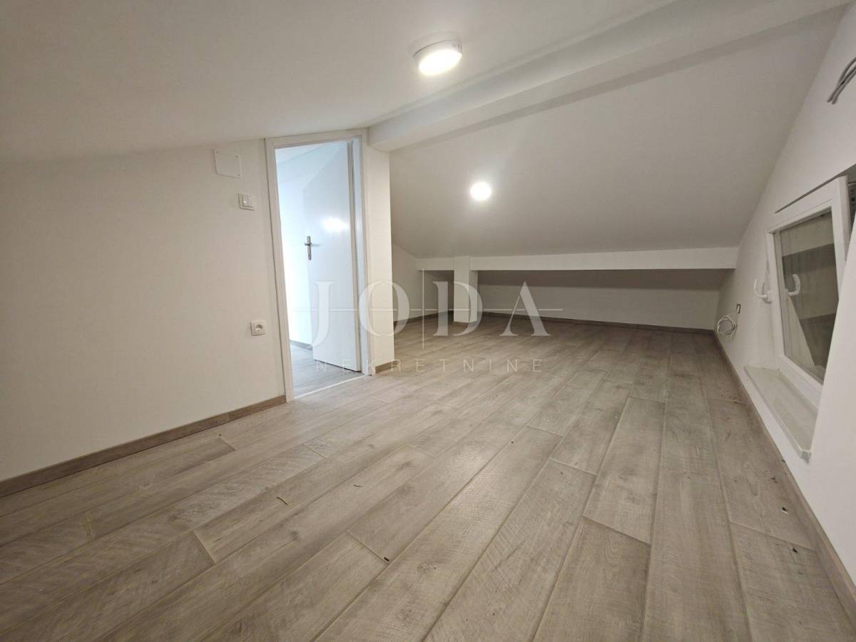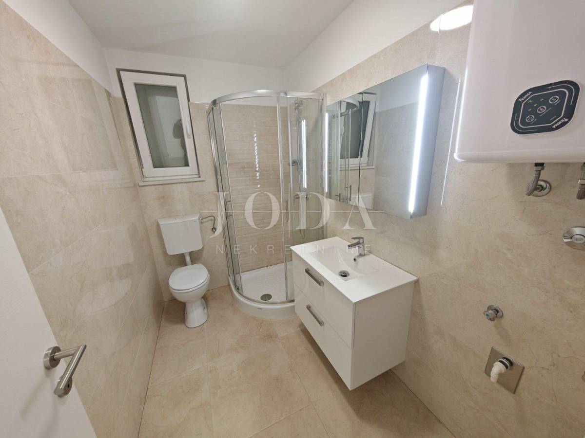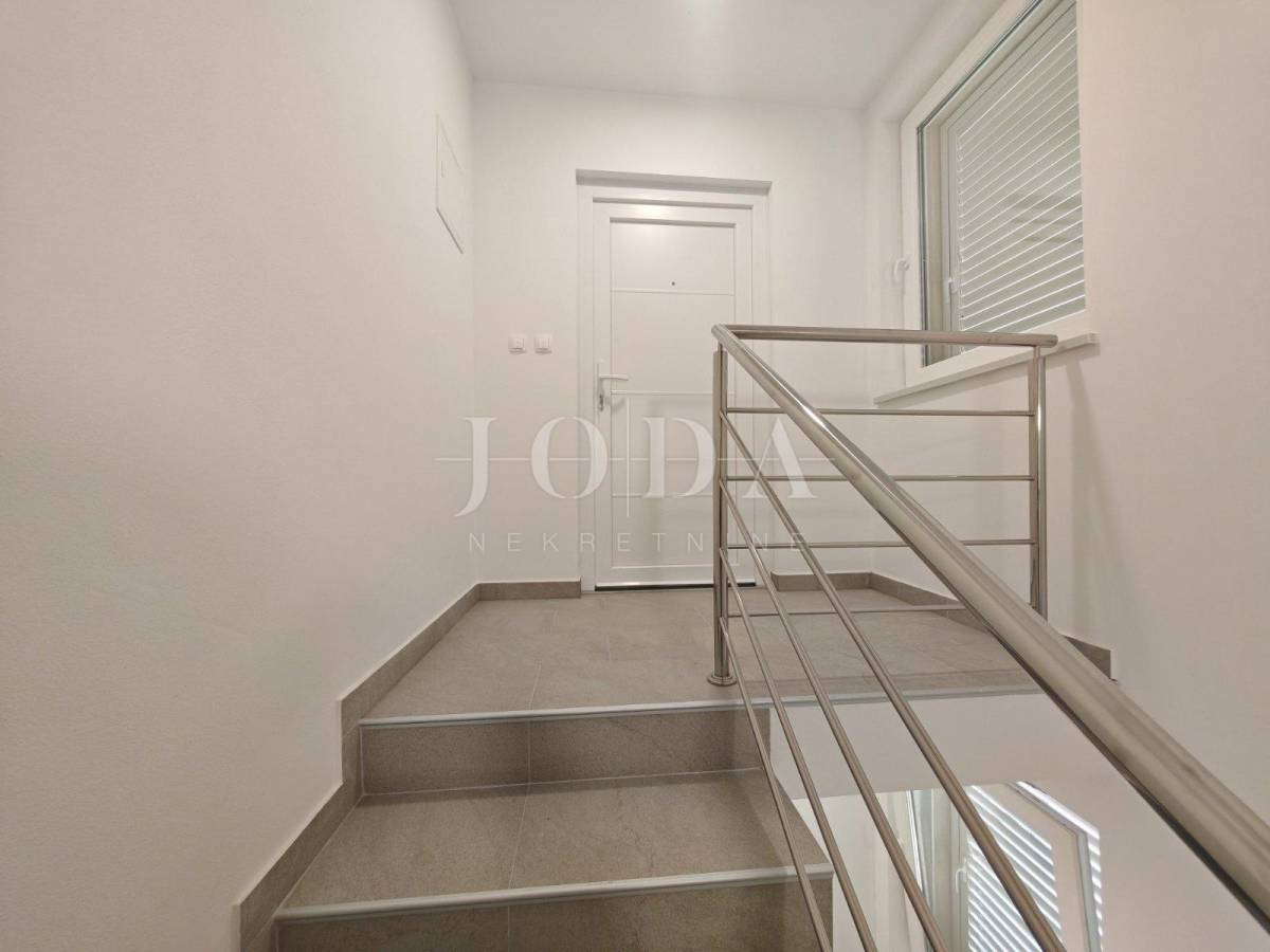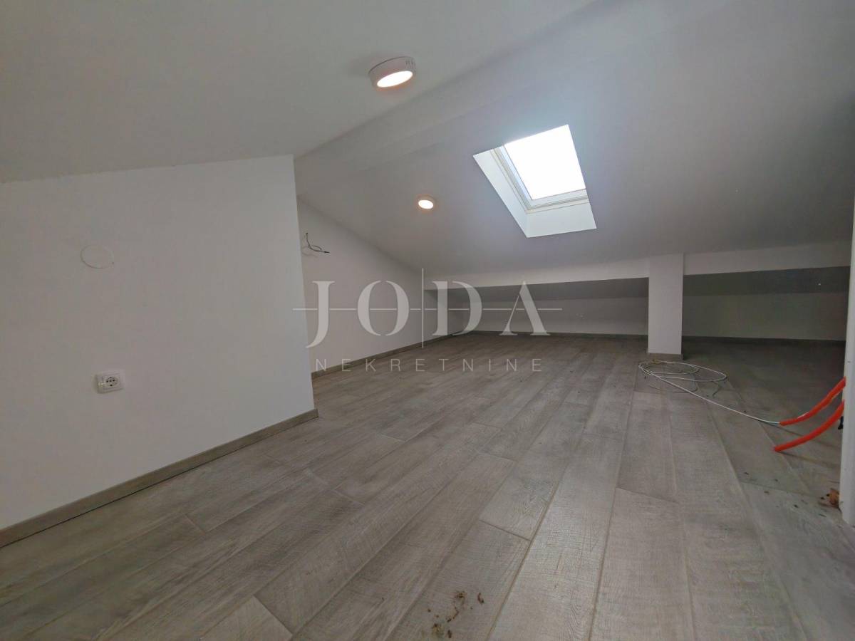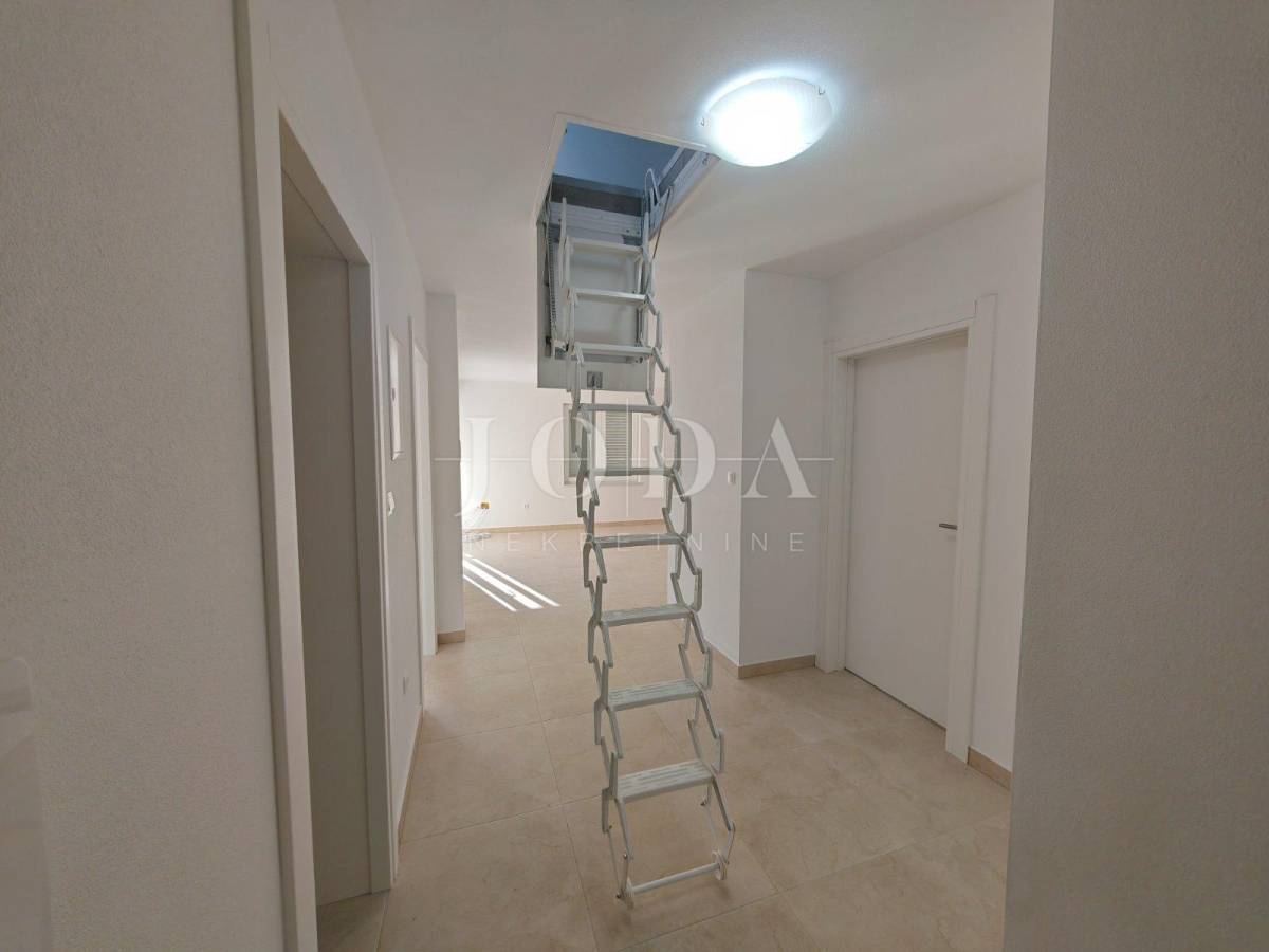 Stan se sastoji od WC-a, kupaonice, dvije spavaće sobe od koje jedna ima izlaz na prostranu terasu s panoramskim pogledom na more i izuzetno prostranog dnevnog boravka s kuhinjom i blagovaonicom open-space koncepta. Unutarnjim montažnim stepeništem dolazimo do tavanskog prostora veličine 25m2 koji je uređen te se može iskoristiti kao dvije dodatne dječje sobe s obzirom da je maksimalna stajaća visina 170cm.